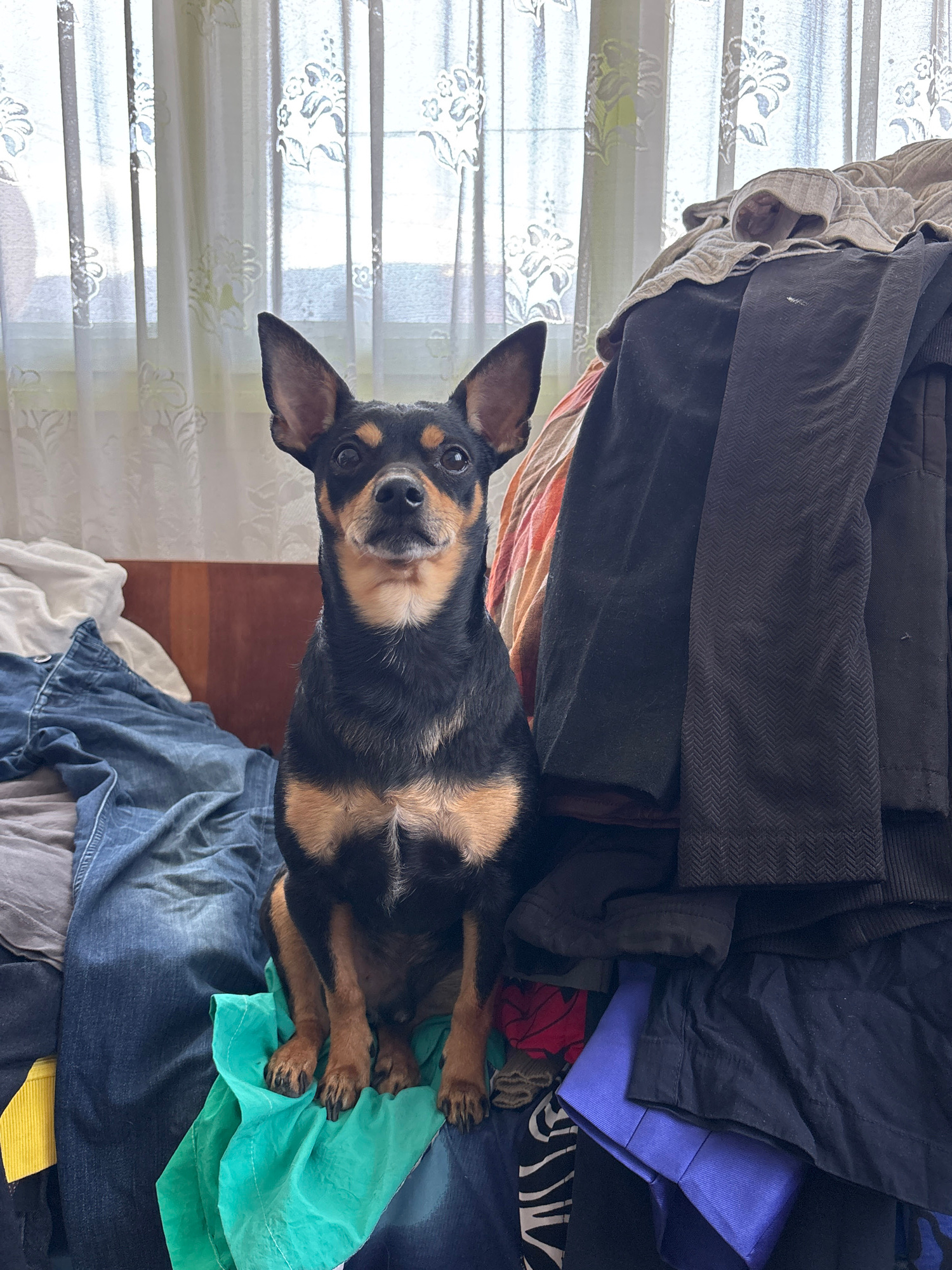 A black and tan dog lies among a pile of clothes on a bed. The clothes are various colors and fabrics, including blue jeans, a green shirt, and several dark-colored garments. A wooden headboard is par…read more