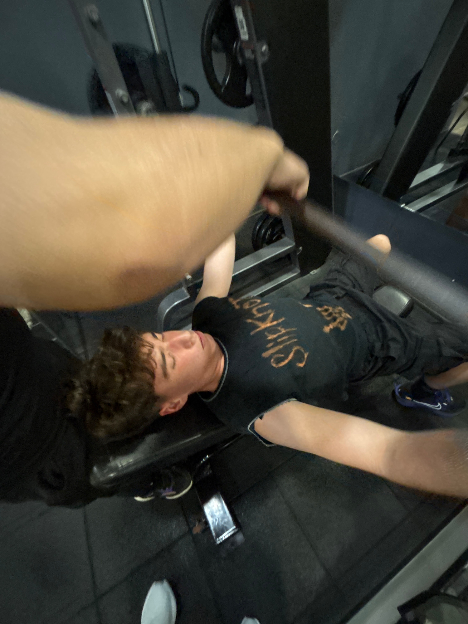 An overhead, slightly blurred shot captures a young person lying on a gym bench, seemingly in the middle of a workout. The image is oriented such that the person's head is towards the bottom of the fr…read more