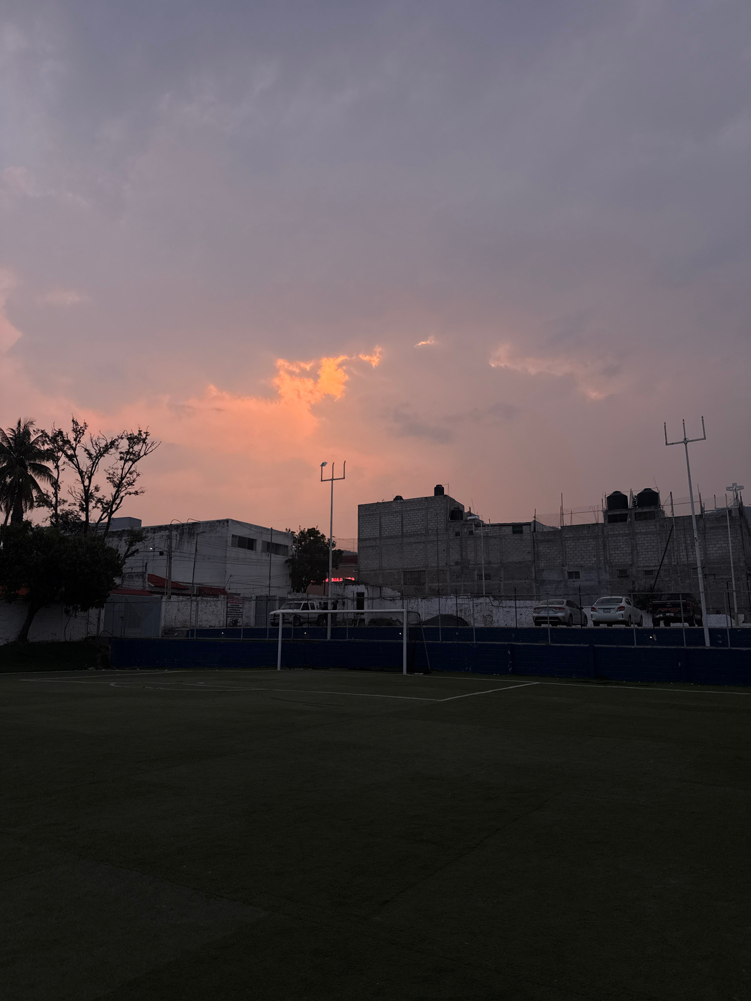 The image captures a cityscape at dusk in Tuxtla Gutiérrez, Mexico. In the foreground is a soccer field, likely artificial turf, with a dividing white line visible. Beyond the field, the scene transit…read more
