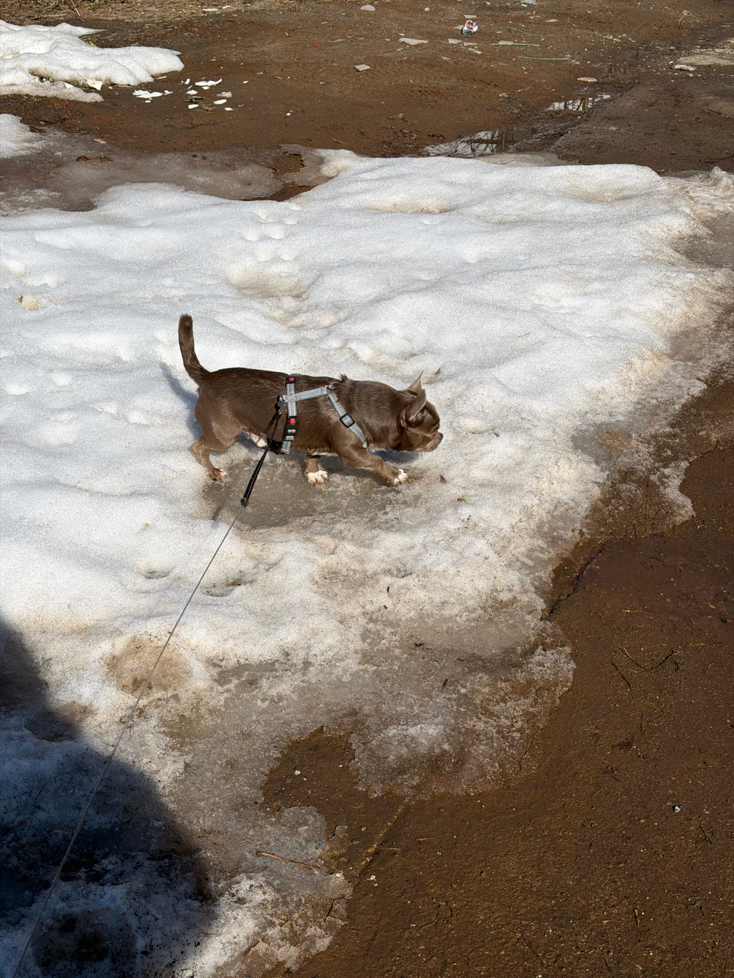 A dog, wearing a harness and leash, stands on snow adjacent to bare ground. The location is Votkinsk, Russia.