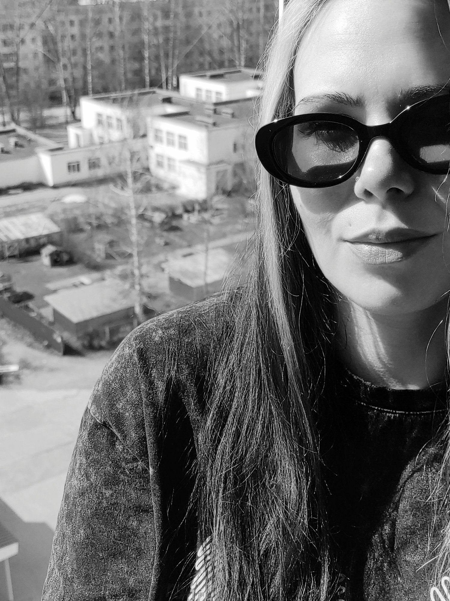 This black and white, close-up portrait features a person, likely female, with long, light-colored hair, wearing dark, oval-framed sunglasses. The subject's face is shown from the forehead to the chinβ¦read more