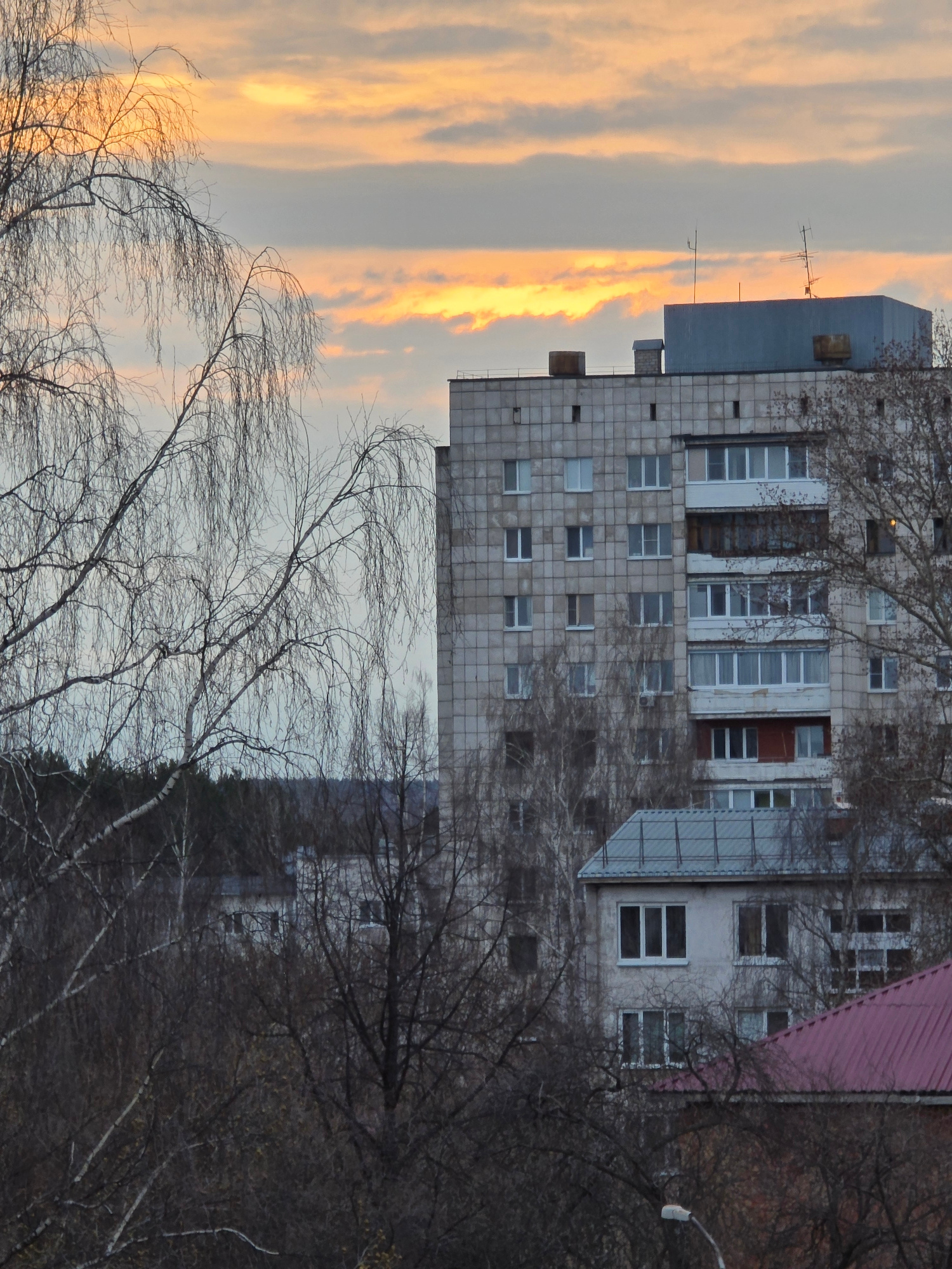 The image shows a street scene in Chaikovsky, Russia. A large, Soviet-era apartment building occupies the center of the frame, its facade made of grey, square tiles. The building has multiple windows,…read more