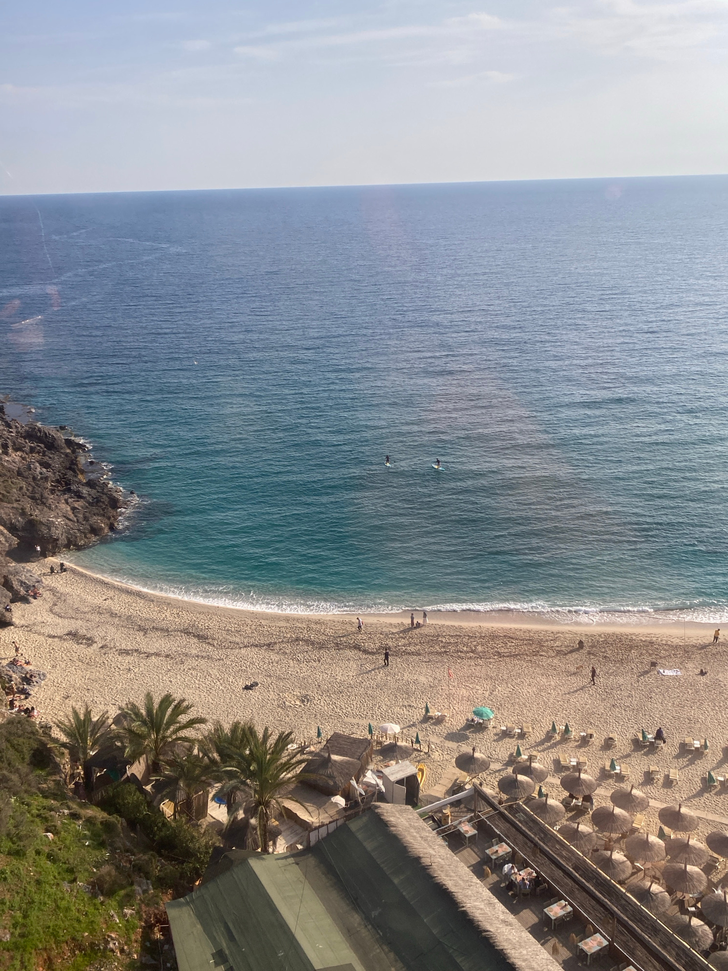 A vertical aerial shot of a beach with a section of the sea next to it. The ocean is dark blue with some light blue areas close to the shore. The beach is sandy with a light brown color. People are sc…read more