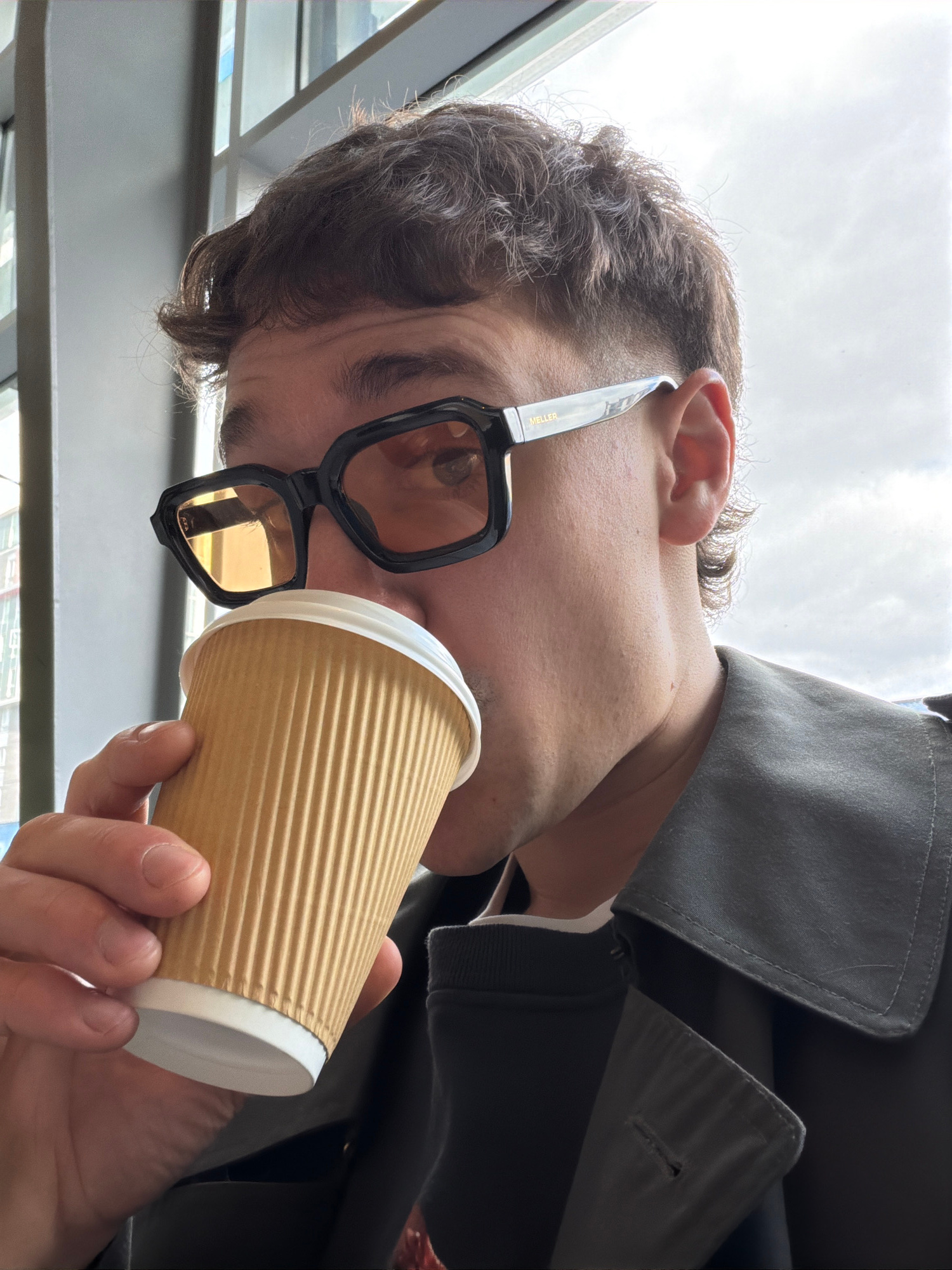 A man with light skin and brown, wavy hair is holding a brown paper coffee cup with a white lid in his right hand. He is wearing black, square-framed glasses and a gray trench coat. The background app…read more