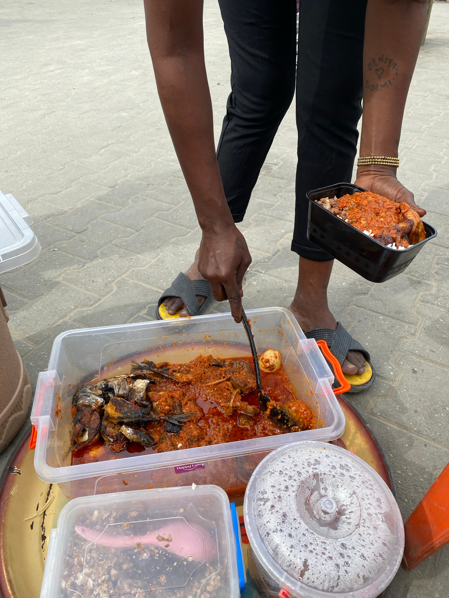 The image captures a street food scene, likely in Lagos, Nigeria, given the style of food preparation and environment. A person is serving food from a large, rectangular, transparent plastic container…read more