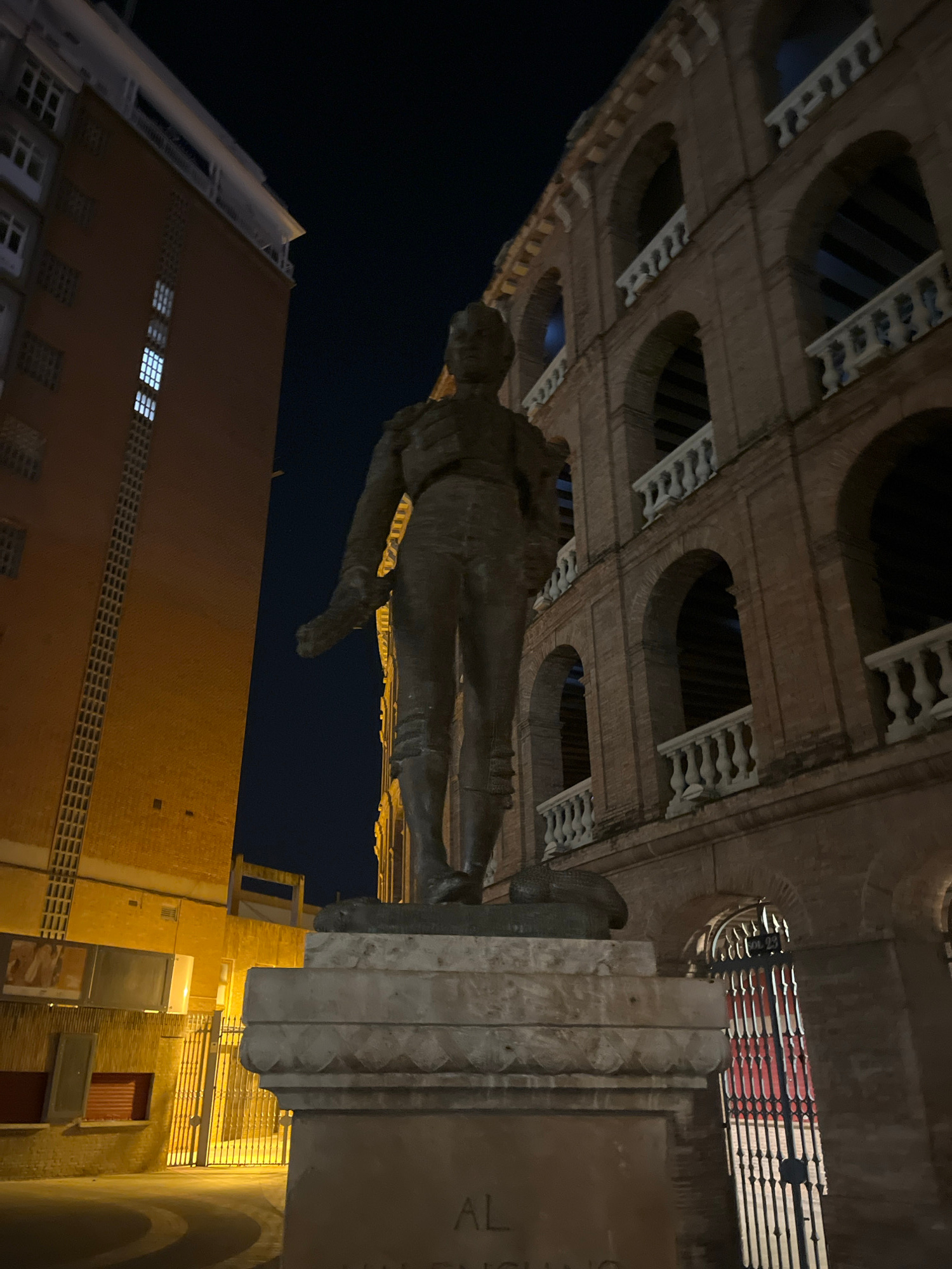 The image shows a statue of Joaquin Sorolla in València, Spain, at night. The bronze statue stands atop a stone plinth, with a partial view of a sign on the plinth that reads "AL VALENC[IANO]". The st…read more