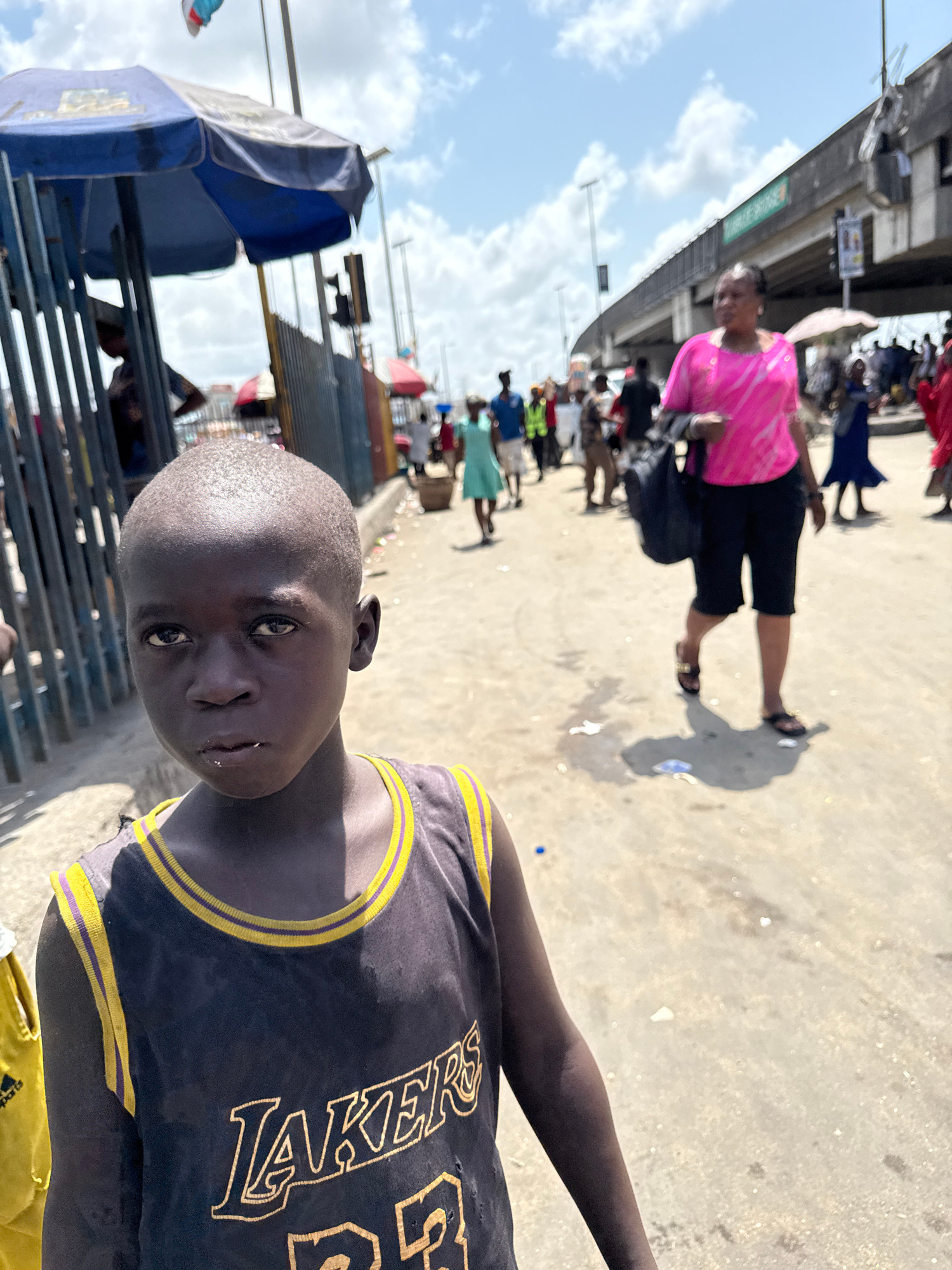 The photo appears to be taken in Lagos, Nigeria. In the foreground is a dark-skinned youth wearing a Lakers basketball jersey. Behind the youth, there is a crowded outdoor market scene with multiple p…read more