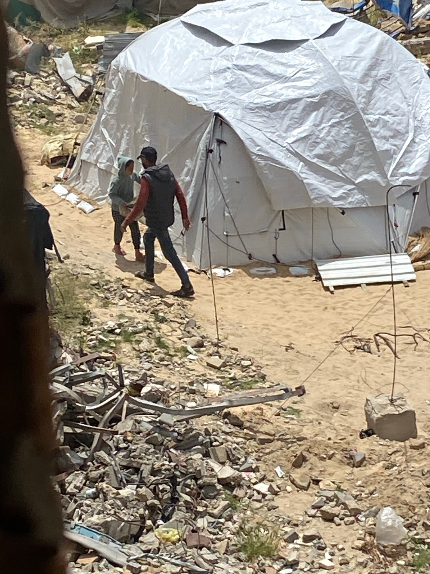 The image shows what appears to be a refugee camp in Khan Yunis, Palestinian Territory. A large, white tent-like structure dominates the left side of the frame, secured with ropes. Two people are visi…read more