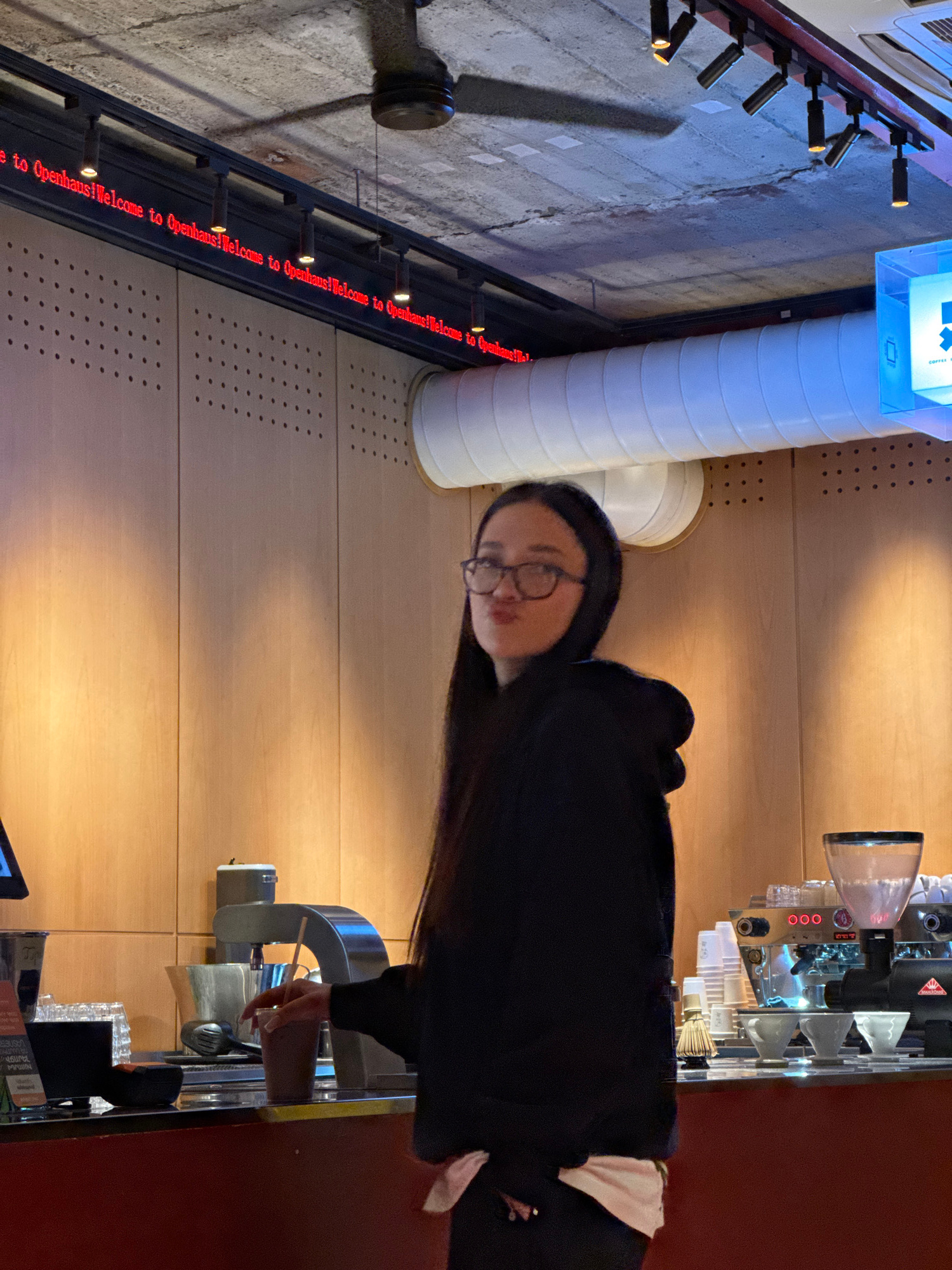Here is a description of the image: A vertically oriented image shows a person with dark hair and glasses standing behind a counter, appearing to make coffee using an espresso machine. The environmen…read more