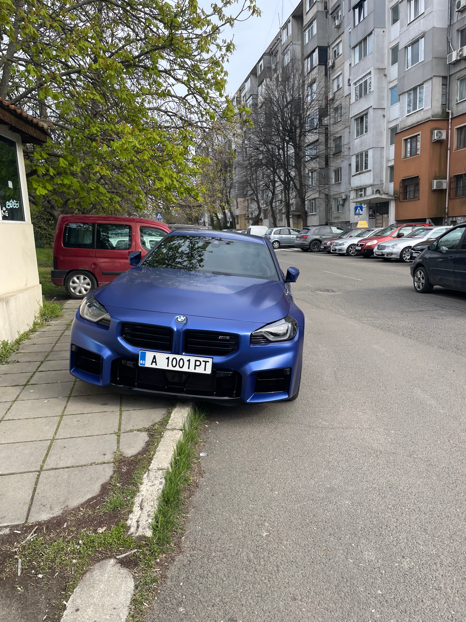 A blue BMW M2 with Bulgarian license plate "A 1001 PT" is parked on the street next to a sidewalk in an urban area. The car is adjacent to a red van. Behind the BMW, there is a row of parked vehicles.…read more