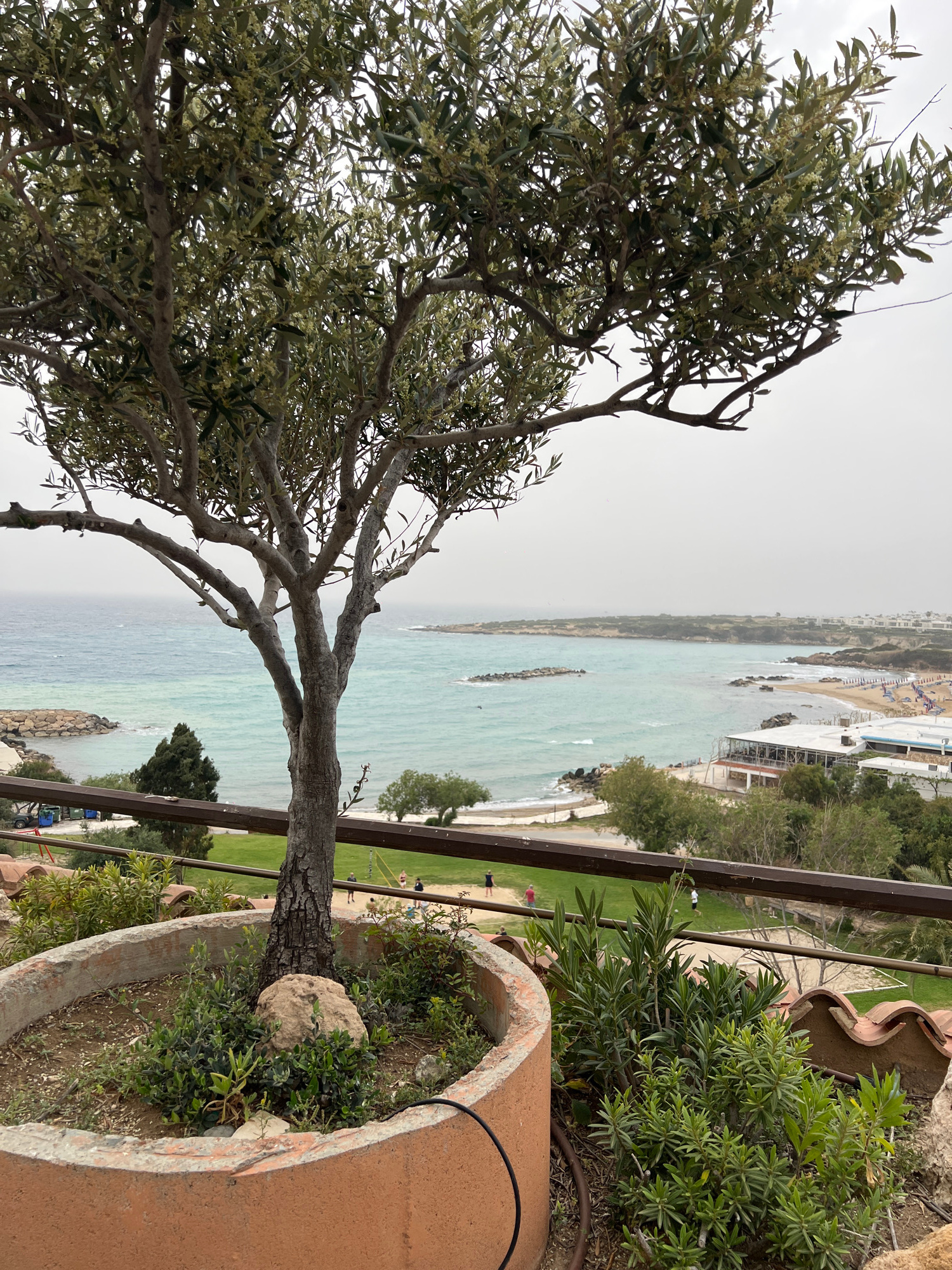 The image presents a panoramic coastal landscape viewed from an elevated perspective, likely a balcony or terrace, under an overcast sky. In the immediate foreground, to the left, a large, mature oli…read more