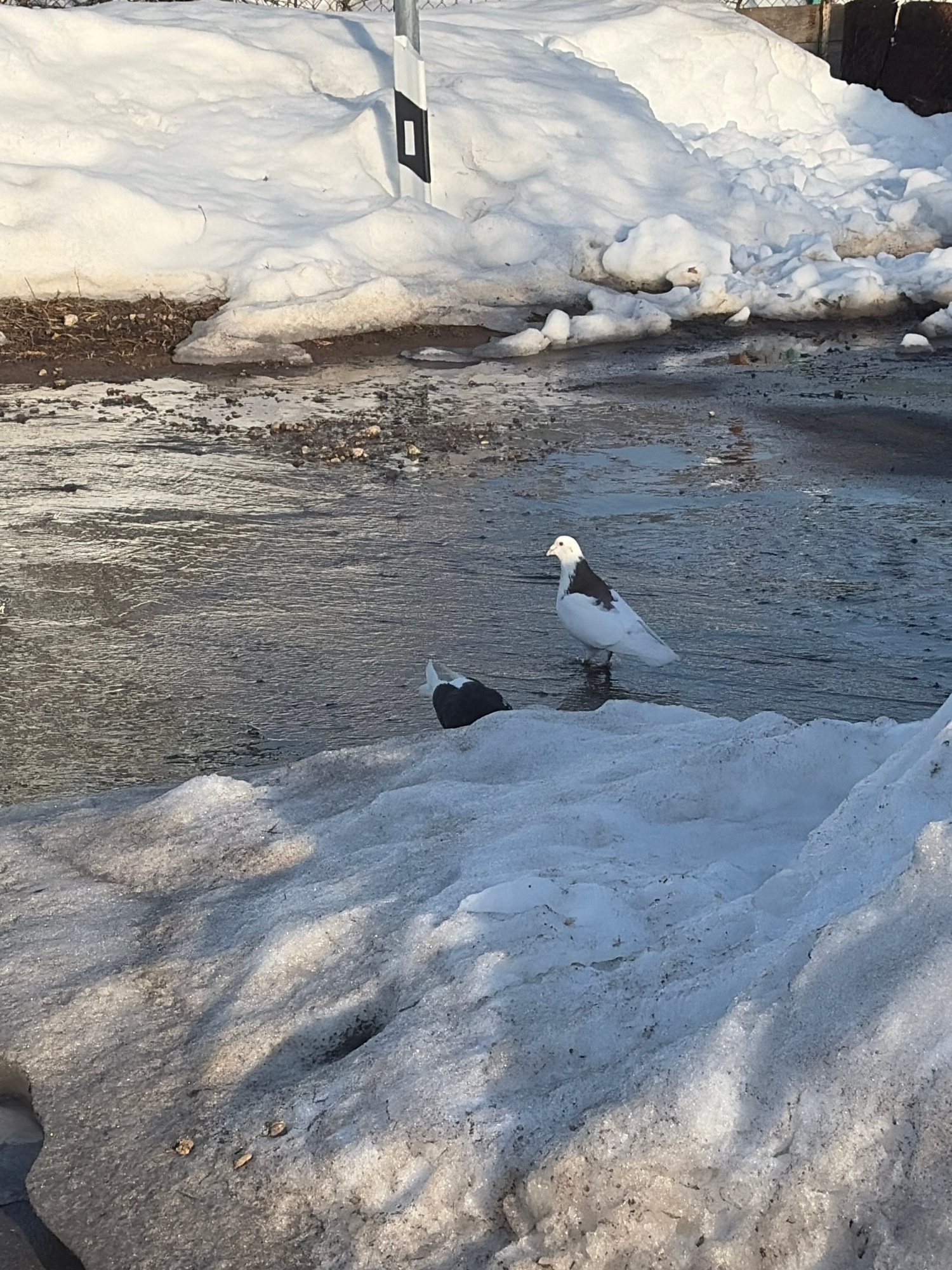 The image depicts a winter scene with snow on either side of a walkway or road. A bird with white and brown feathers is standing on the walkway. The location is Kozlovka, Russia.