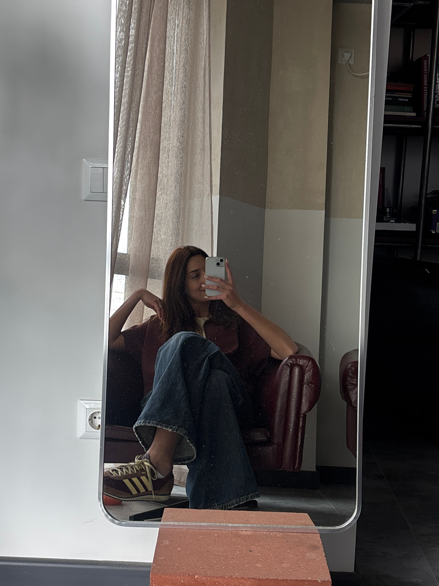 The image is a reflection in a mirror showing a woman sitting in a red leather armchair, holding a smartphone, presumably taking a selfie. The setting appears to be indoors. Behind the woman are curta…read more