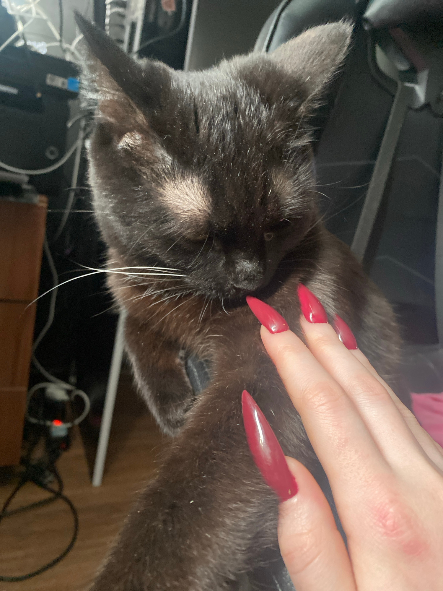 A close-up indoor shot shows a black cat lying down while being petted by a person's hand. The person has long, dark red stiletto nails. The background includes what appears to be a desk with computer…read more