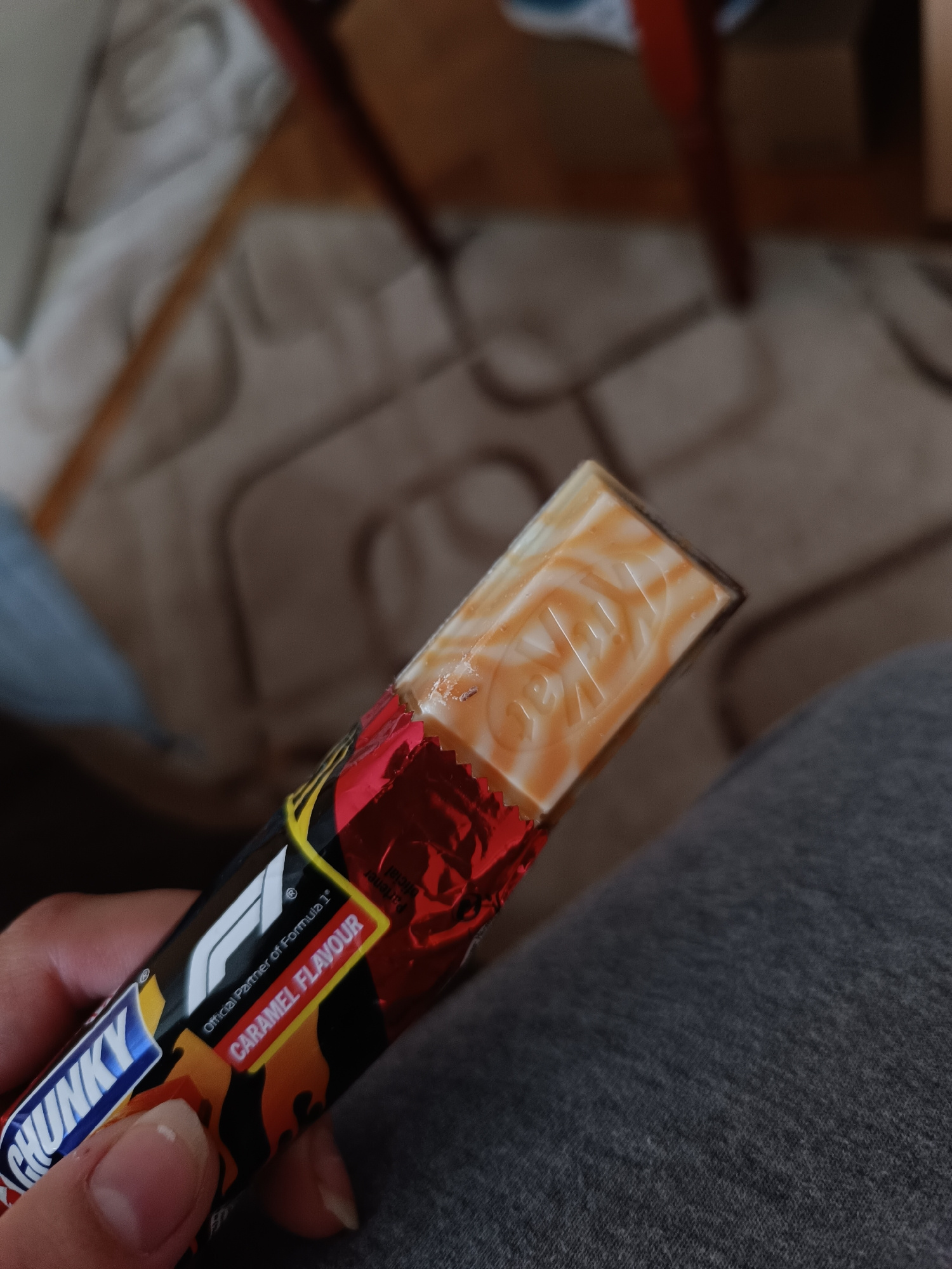 A close-up shot captures a person's hand holding a partially opened KitKat Chunky chocolate bar in an indoor setting in Pleven, Bulgaria. The hand, with visible fingers and neatly kept nails, grasps the red and black wrapper of the confection. The chocolate bar is clearly a "KitKat CHUNKY" with a "CARAMEL FLAVOUR," as indicated by the text on its packaging. It proudly displays the "F1" logo and states "Official Partner of Formula 1®," suggesting a special edition product. The top portion of the chocolate bar is exposed, revealing a surface with intricate swirls of white and caramel-colored coating, typical of a caramel-flavored chocolate. The brand name "KitKat" is subtly embossed into this caramel layer. The background is softly blurred, indicating a shallow depth of field, and shows elements of a domestic environment. A light-colored patterned rug or carpet is visible, along with the dark, possibly wooden, legs of furniture like a chair or table. To the right, a segment of grey fabric, likely clothing such as a pant leg or a blanket, is present. The lighting is consistent with an indoor setting, but the specific time of day is not discernible. No particular activity beyond holding the chocolate is depicted, and no specific emotions are conveyed. | Open Wire