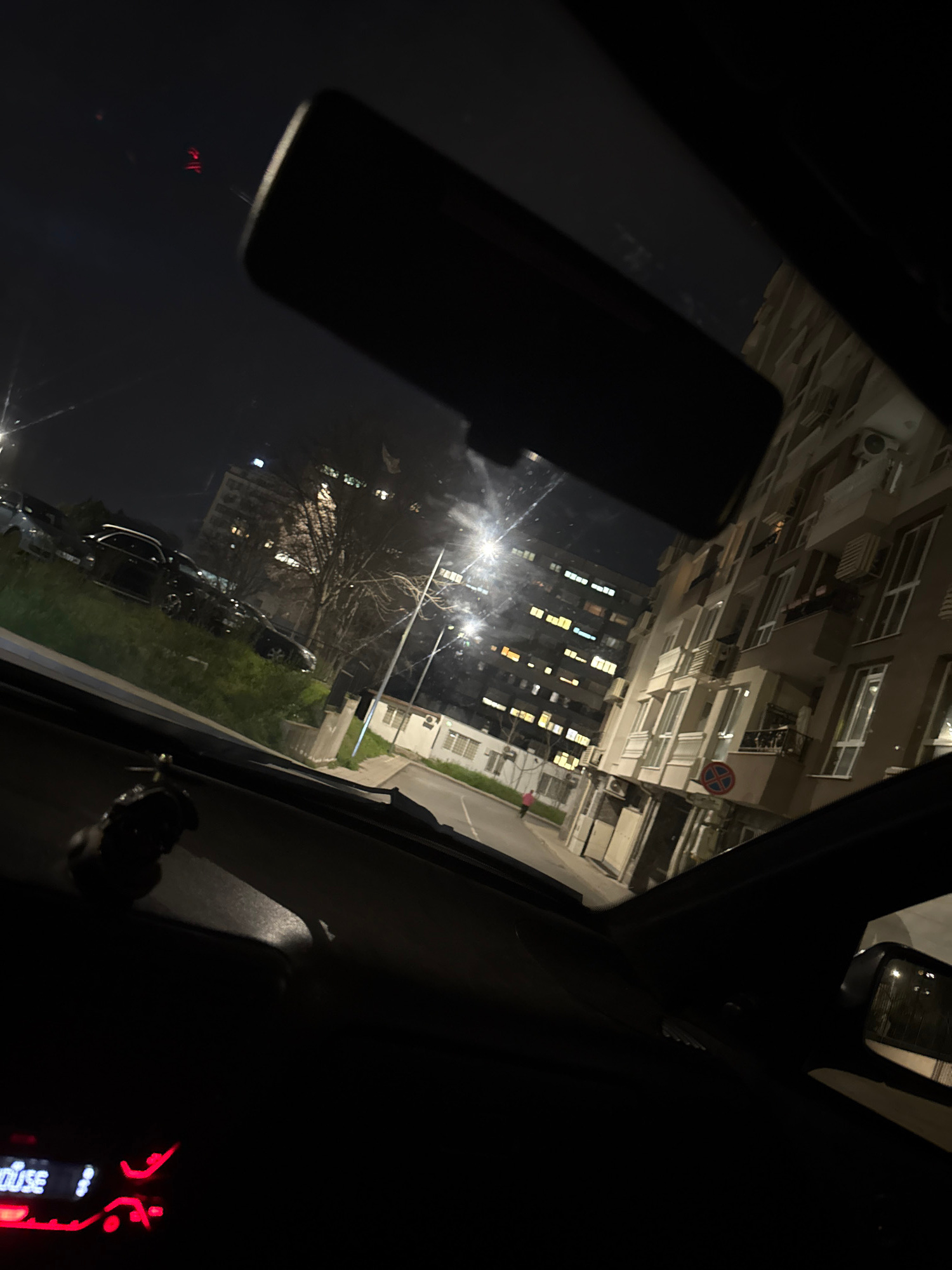 The image shows a nighttime scene from inside a car in Burgas, Bulgaria. The car's interior is visible in the foreground, with parts of the dashboard and rearview mirror discernible. Through the car w…read more
