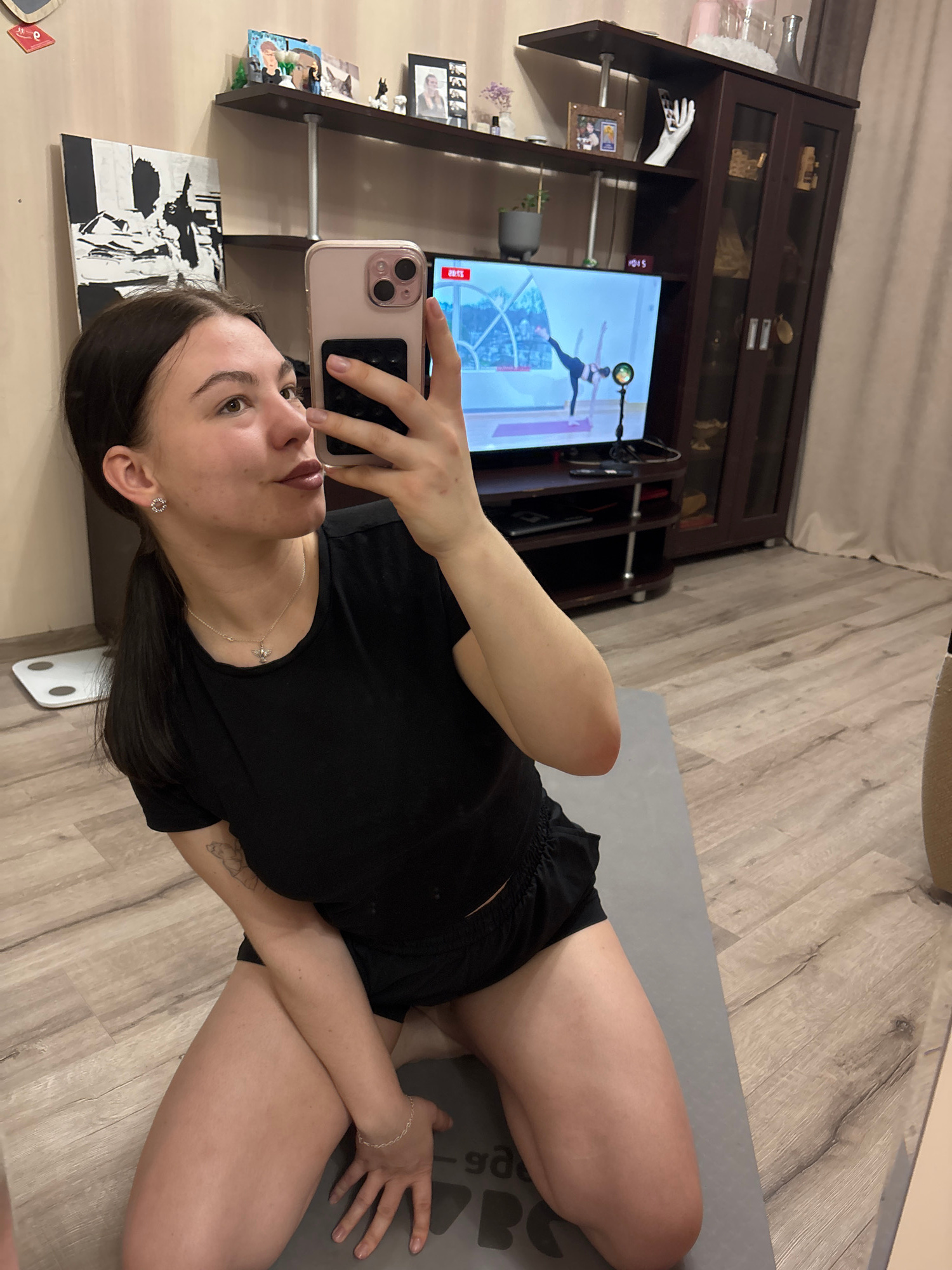 A woman is taking a selfie indoors. She is on a gray yoga mat on a light-colored wooden floor. She is wearing a black t-shirt and shorts. In the background, there is a dark wooden entertainment center…read more