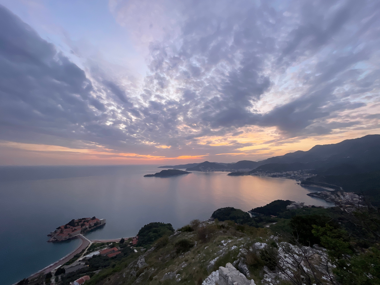 This expansive, elevated panoramic view captures the iconic Sveti Stefan island and the Montenegrin coastline, likely at sunset or sunrise. The foreground features rugged, rocky terrain with sparse ve…read more