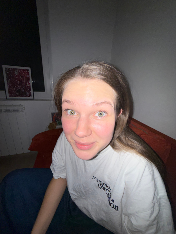 A woman with light brown hair and green eyes smiles at the camera. She wears a white t-shirt with "It's Time for a Vacation" printed in black. The background includes a dark gray wall, a window with a…read more
