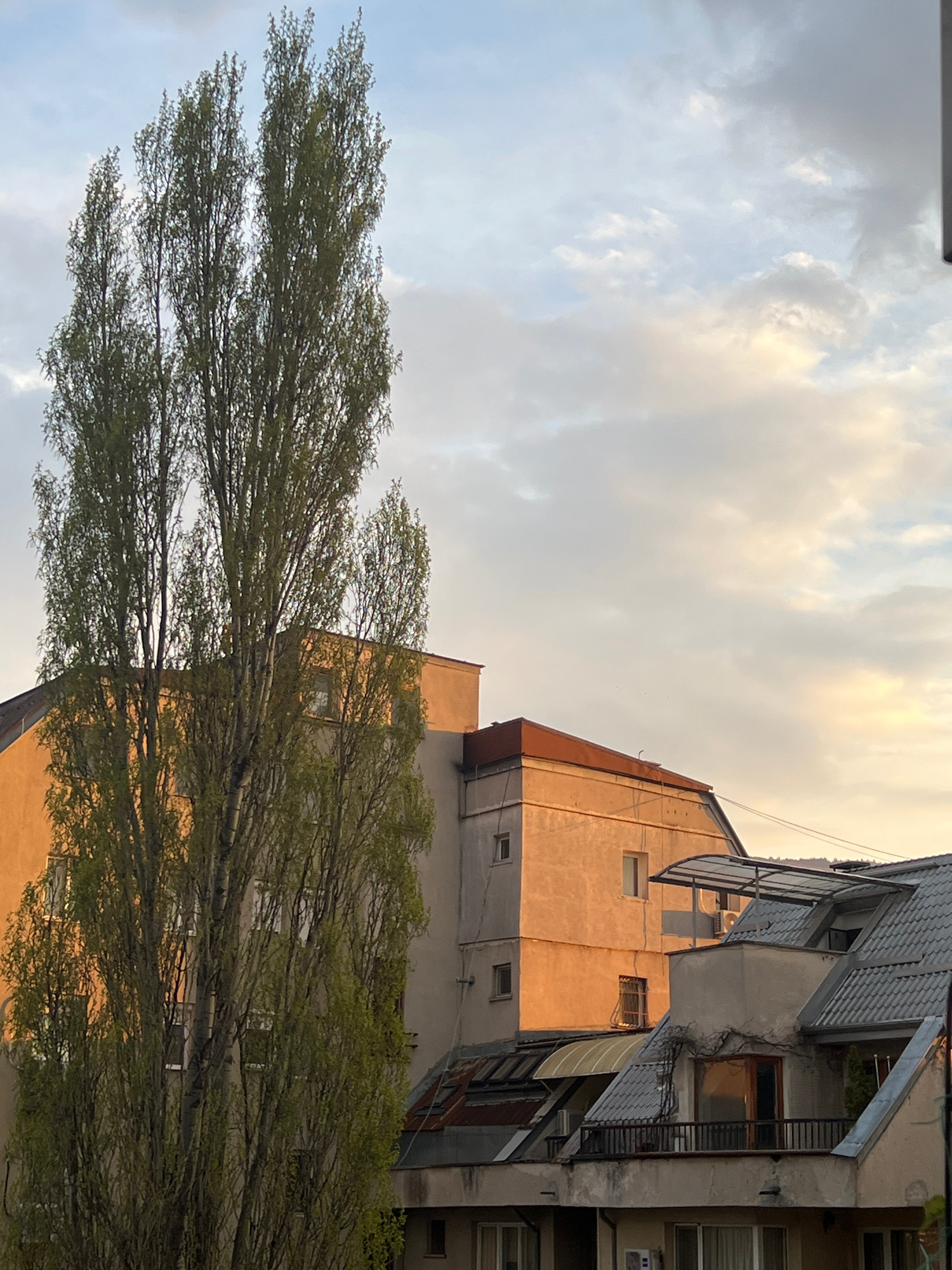 This image, captured in Sofia, Bulgaria, depicts an urban scene featuring buildings and a large deciduous tree under a cloudy sky, likely during late afternoon or sunset. The perspective is angled upw…read more