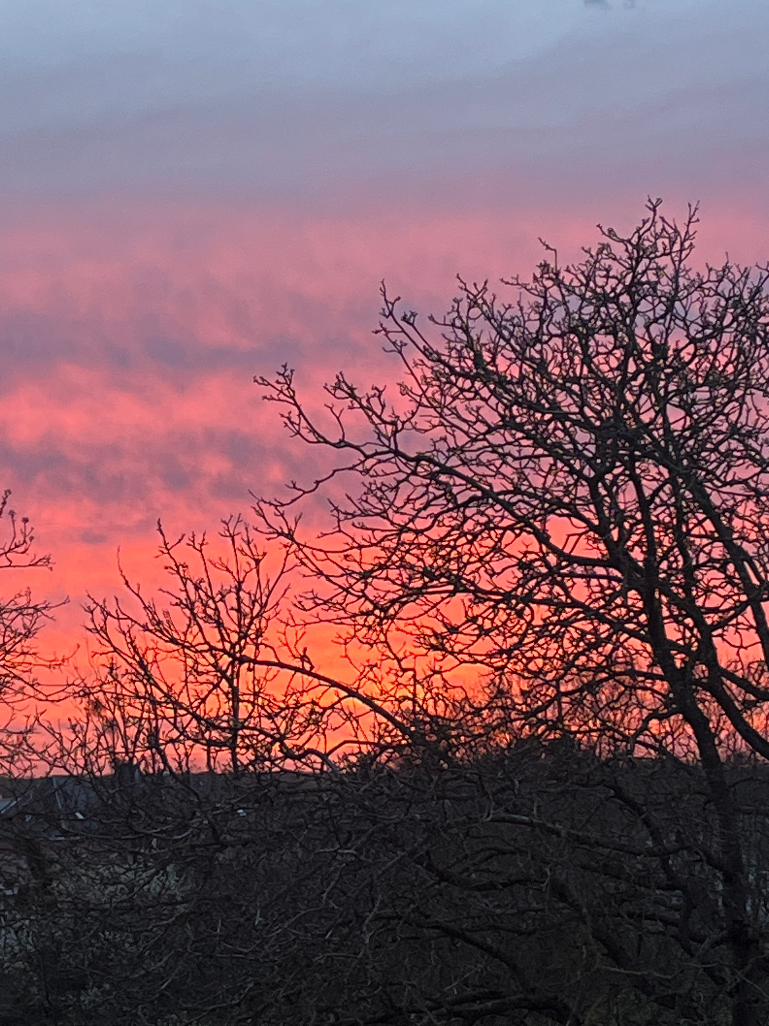 The image shows a dusk or dawn scene with a tree silhouetted against a colorful sky. The sky is predominantly pink and orange, with a strip of grayish-blue visible on the left side. The tree is leafle…read more
