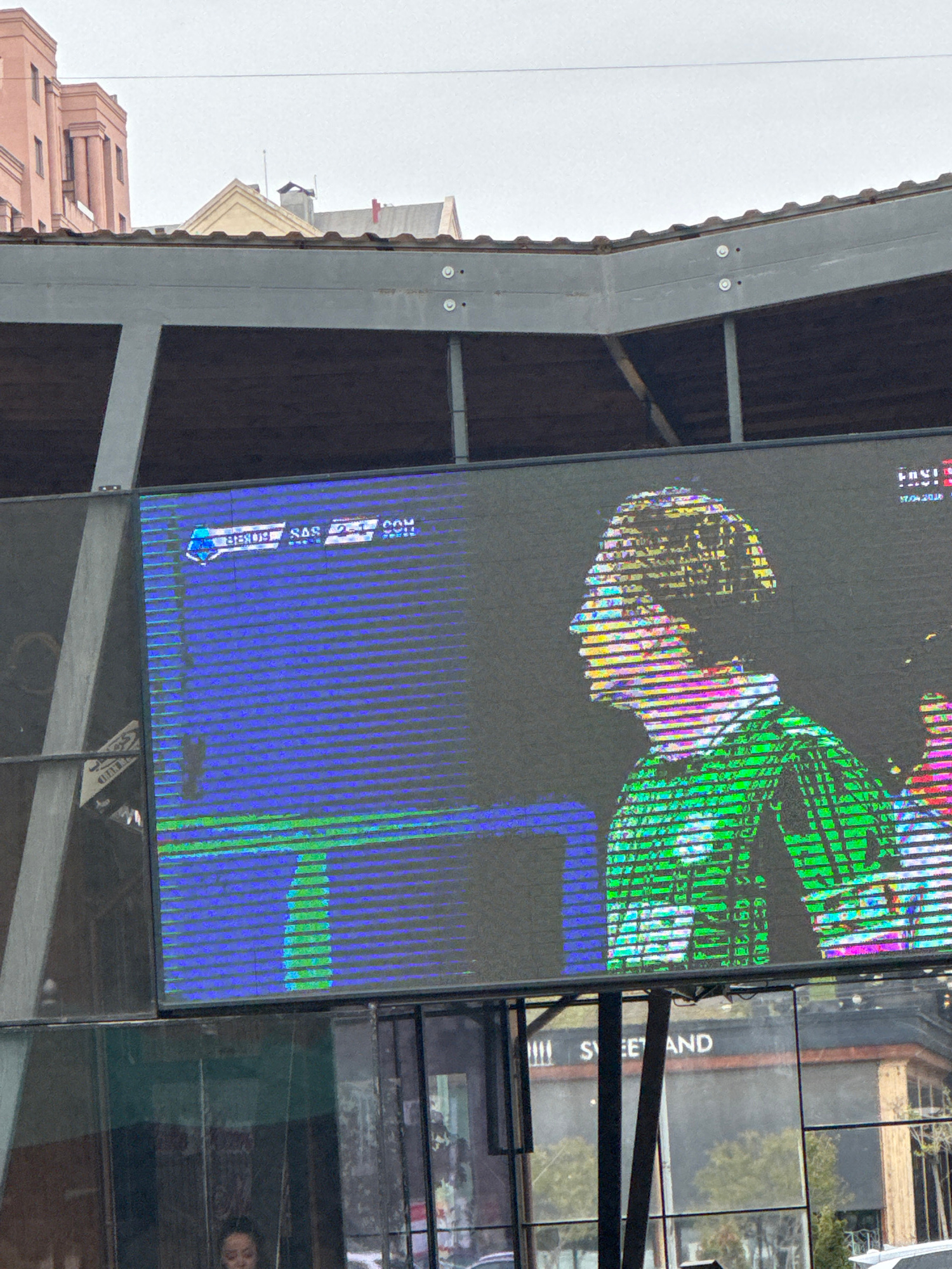 Captured at an angle, the image showcases a large outdoor LED screen displaying a distorted image, likely a video feed, with noticeable vertical banding. The colors are primarily blue, green, and yell…read more