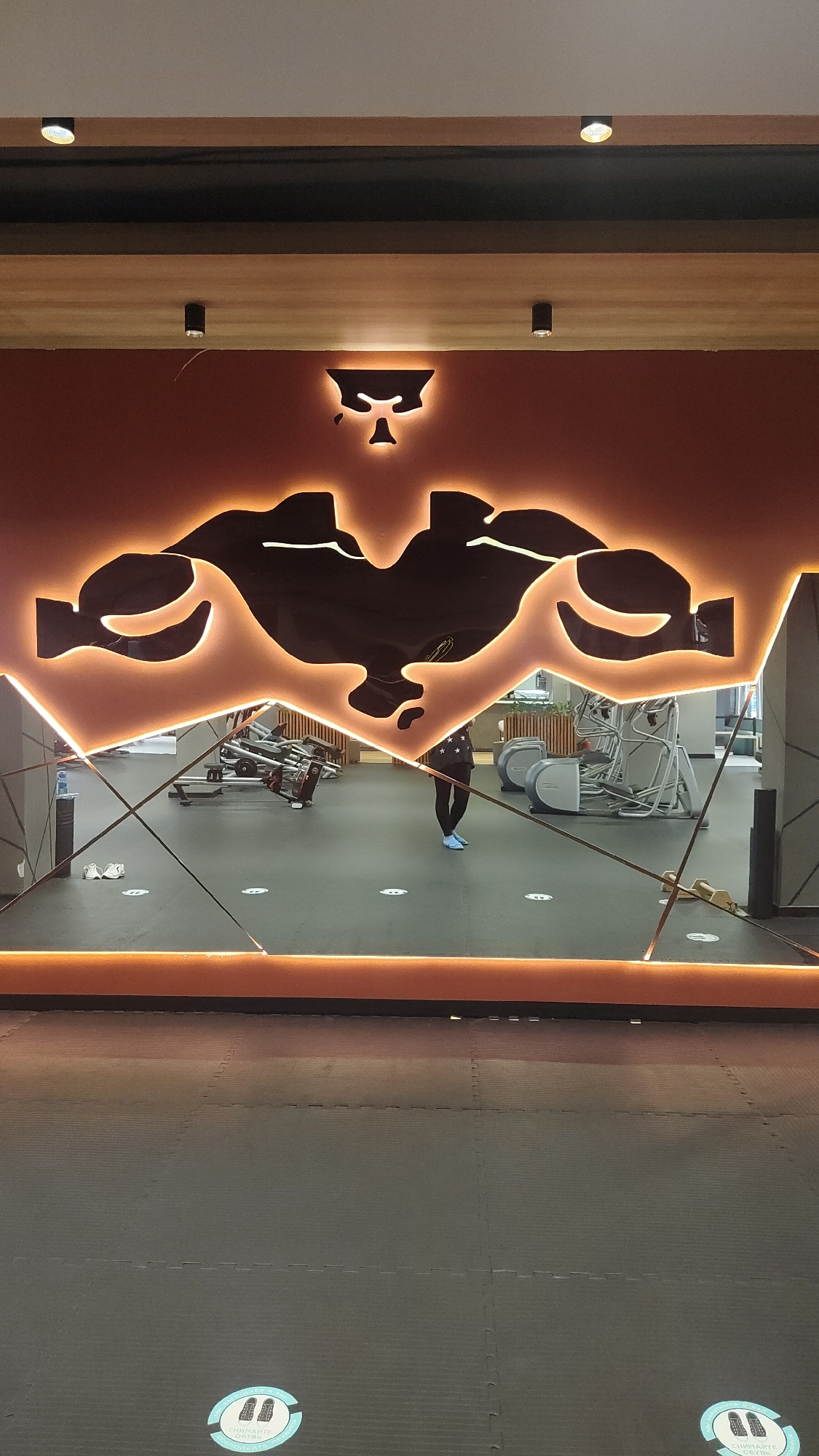 The image captures an indoor scene, likely the entrance area of a gym or fitness center in Krasnoyarsk, Russia. The perspective is looking towards a wall featuring a large, dark, backlit decorative el…read more