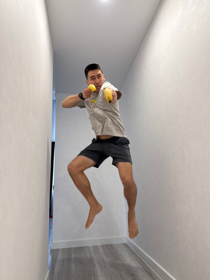 An adult male subject is depicted mid-air in a narrow interior hallway, approximately centered in the frame. He is East Asian, with short dark hair, wearing a light grey t-shirt, dark grey shorts, andβ¦read more