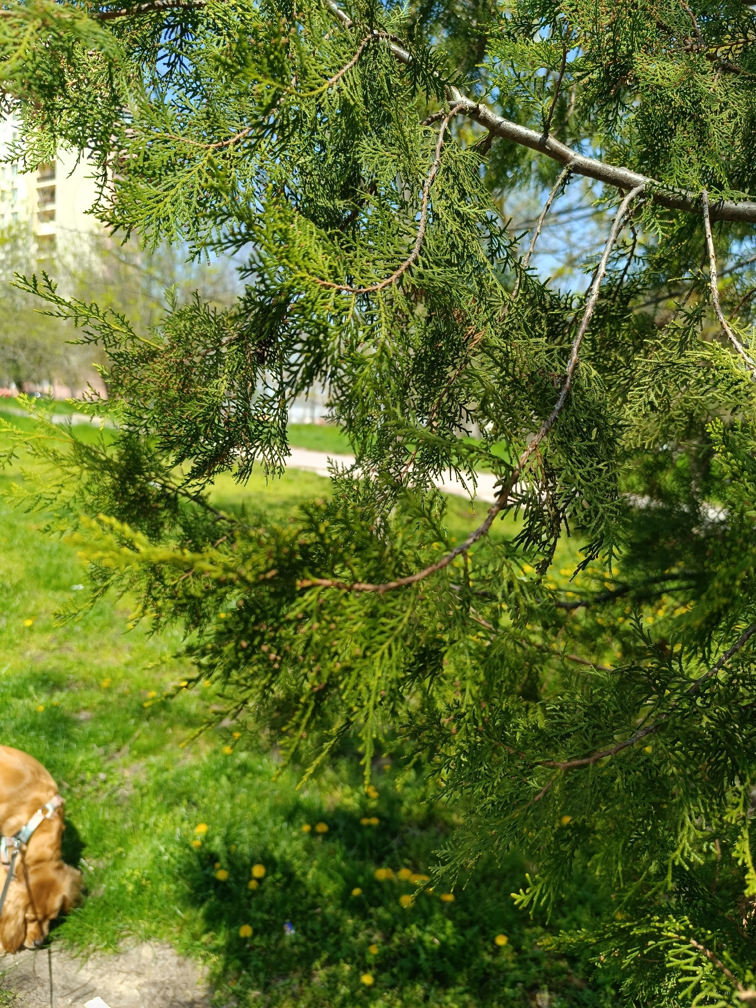 This image captures a vibrant outdoor scene on a clear, sunny day in Pleven, Bulgaria. The dominant subject in the foreground and mid-ground is a dense, green coniferous tree, likely an Arborvitae (Th…read more