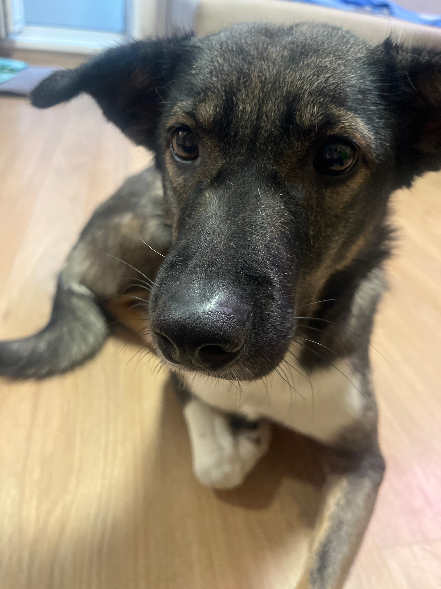A close-up, slightly rotated, eye-level shot depicts a dog. The dog's face is predominantly black and brown, with white markings visible on its chest. The dog's dark eyes are wide and appear to be foc…read more