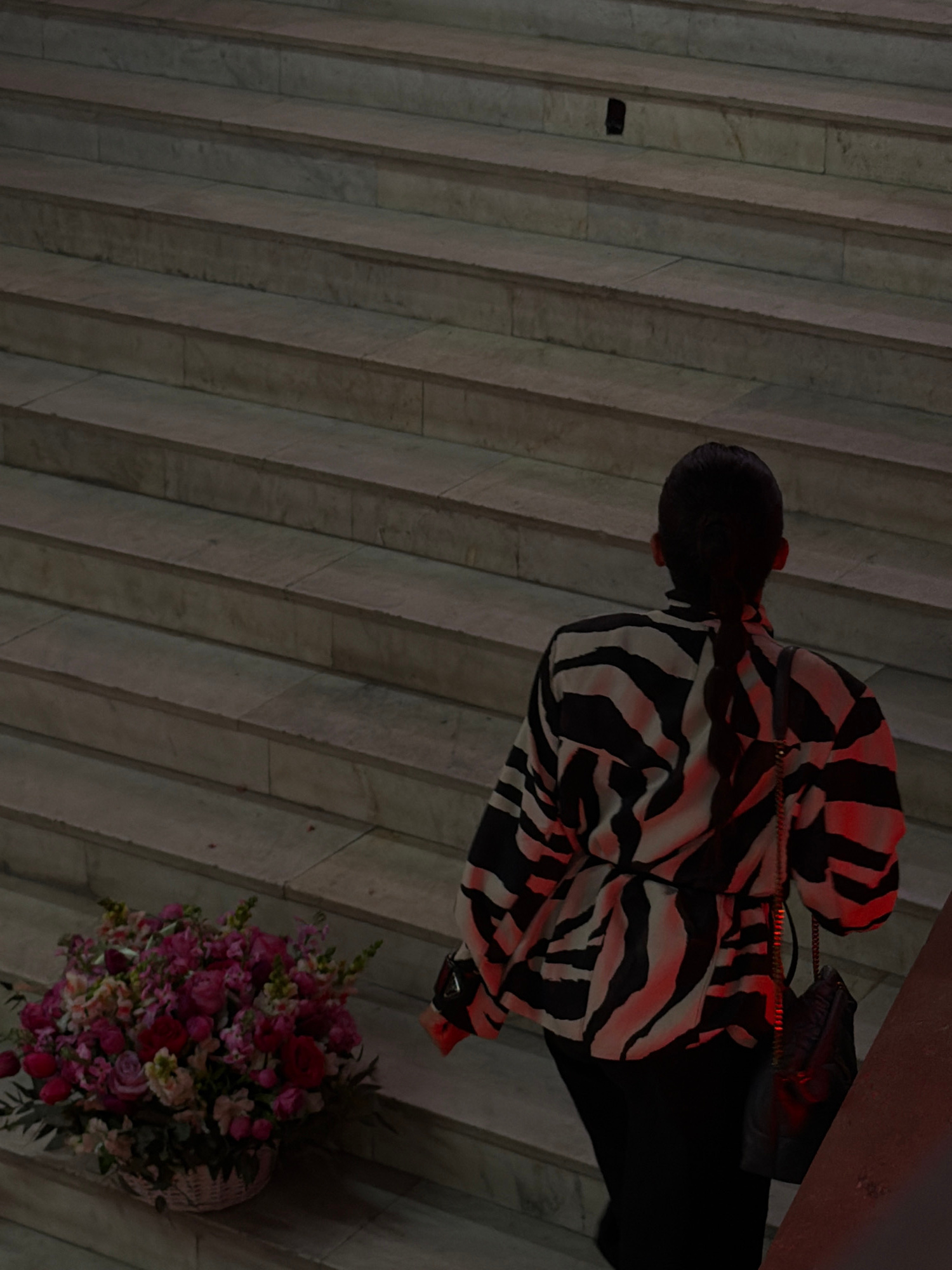 A high-angle, softly lit photograph shows a person standing on a pale gray, ridged stone surface in Yerevan, Armenia. The person is wearing a black-and-white zebra-striped jacket and black pants, and…read more