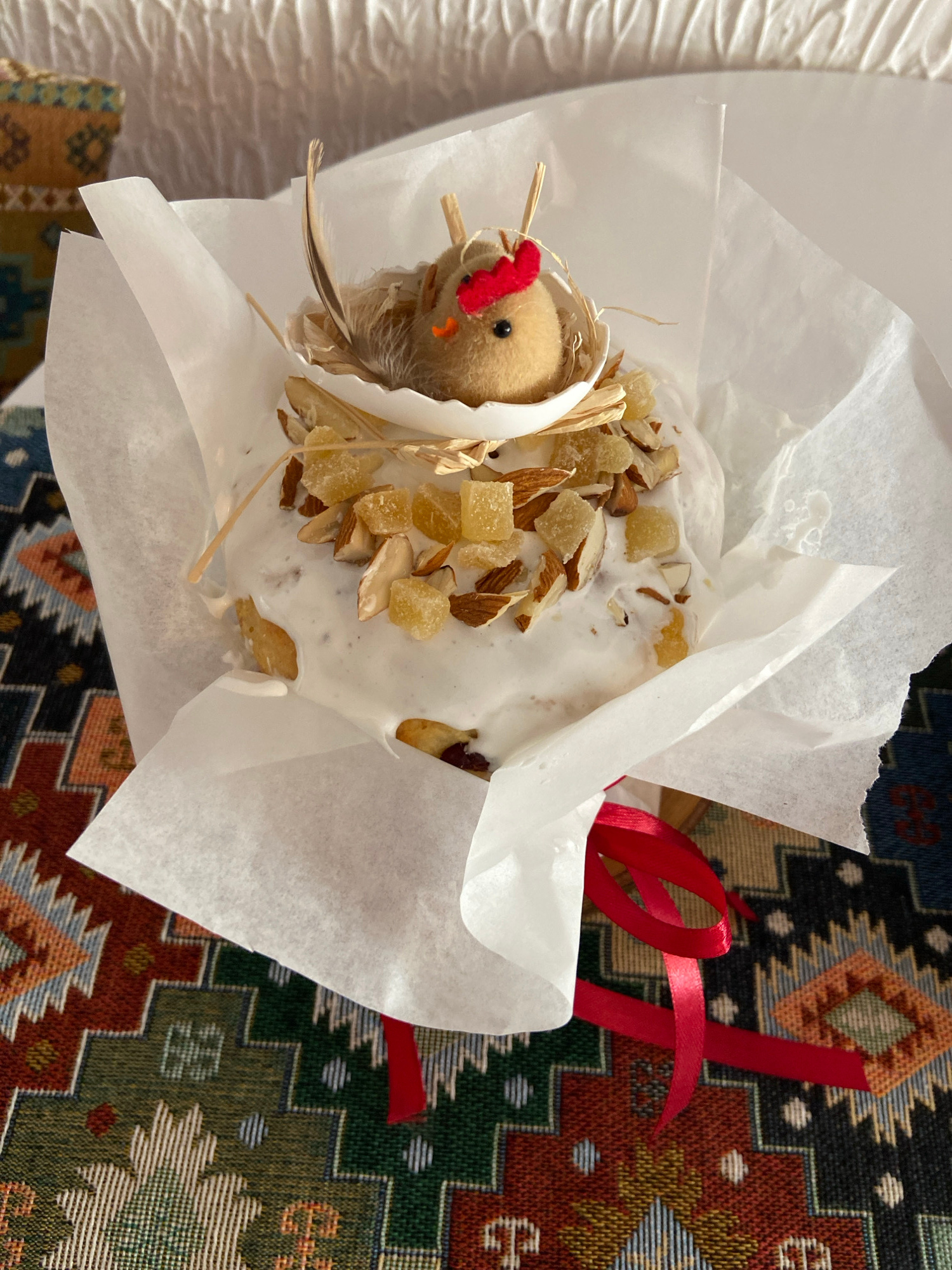 The image shows an Easter cake, known as Kulich, presented in white parchment paper. The cake is topped with white icing, chopped almonds, and candied fruit. A decorative chick sits in a broken eggshe…read more