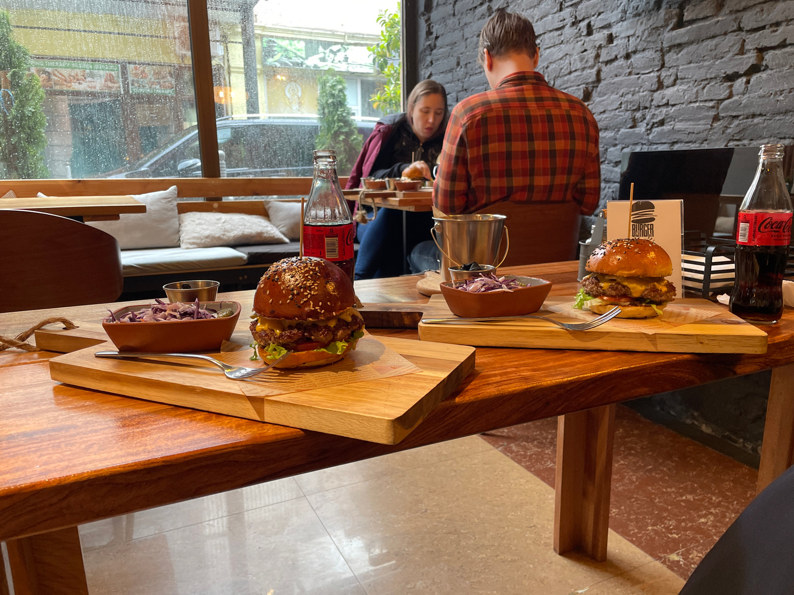 The photograph depicts an indoor dining scene, likely at a restaurant located in Batumi, Georgia. Two burgers are prominently displayed on wooden serving boards, one on each side of a wooden table. Ea…read more