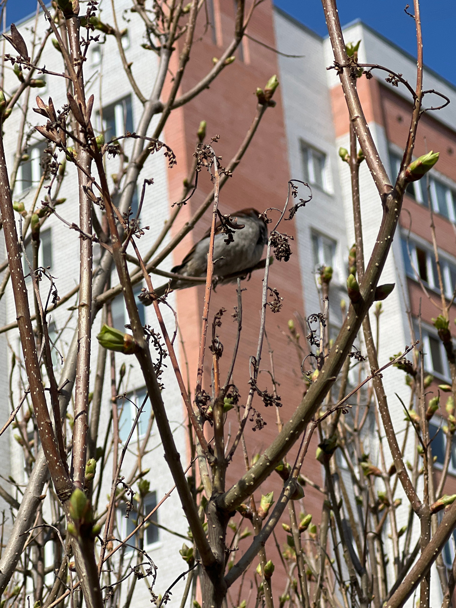 The image shows a bird perched on a branch of a tree. The branches are bare except for some new buds that are starting to open. Behind the tree is a building with alternating rows of white and brown.…read more