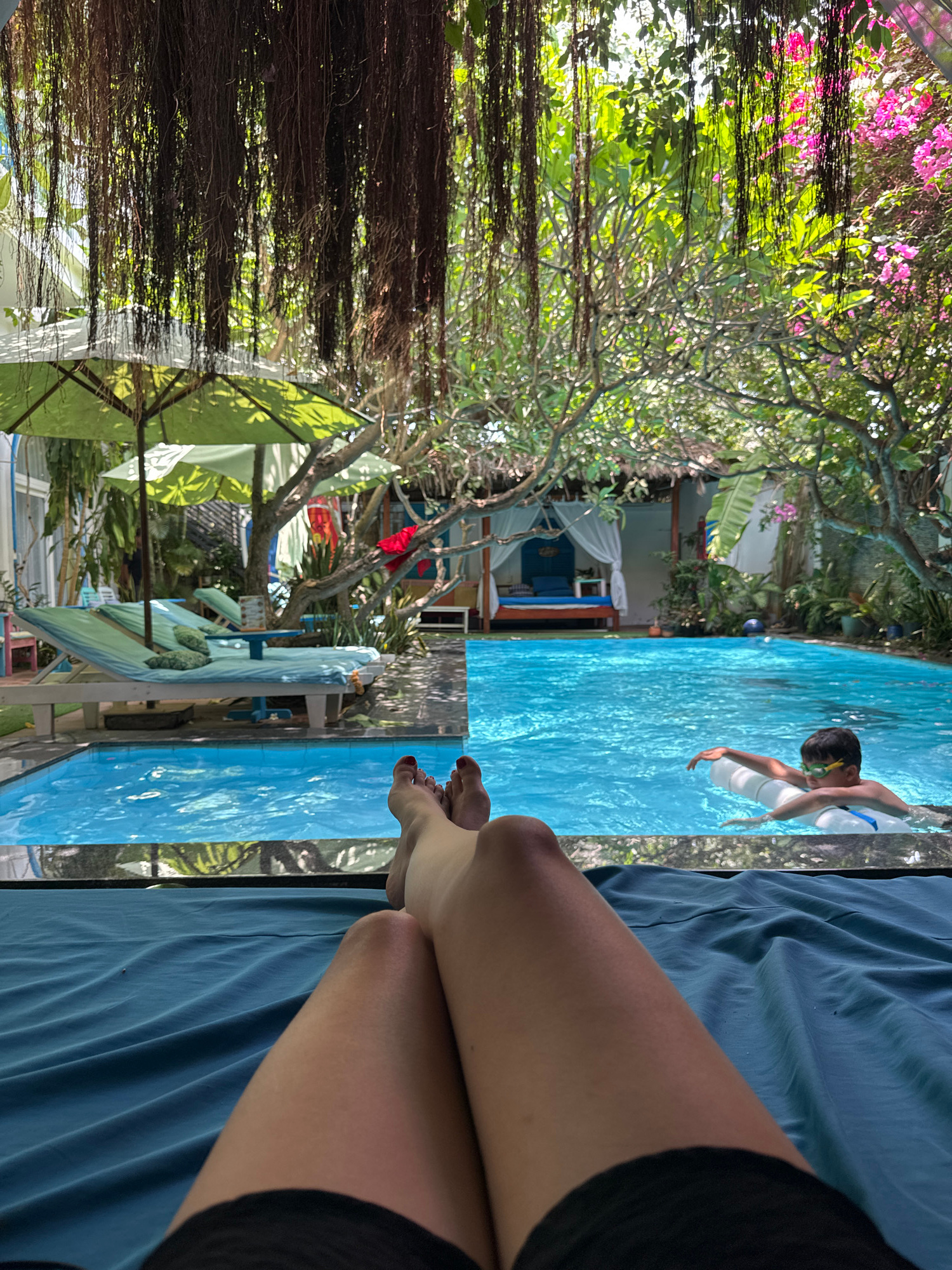 A person is reclining on a blue lounge chair next to a blue-tiled swimming pool. Another person is swimming in the pool, wearing a white top and goggles with a white inner tube flotation device. The f…read more