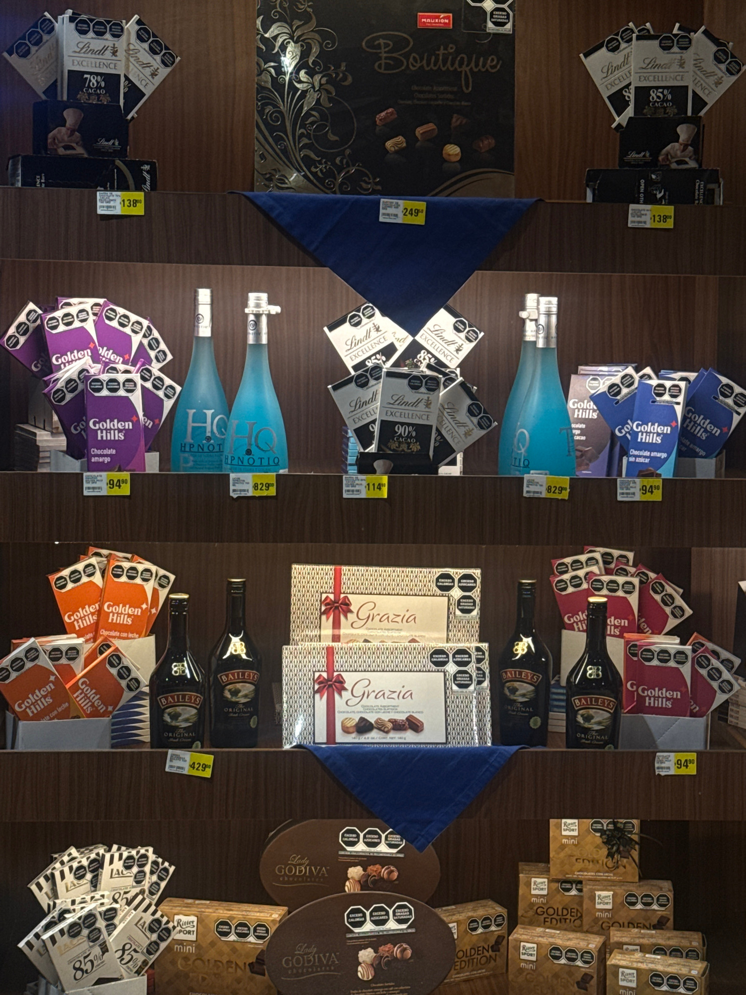 The image depicts a shelf in a store, presumably in Unknown, Unknown, filled with various chocolates and alcoholic beverages. Several brands of chocolate are present, including Lindt, Golden Hills, Grazia, Lady Godiva, Ritter Sport mini, and Mauxion Boutique. Also visible are bottles of Baileys Original Irish Cream liqueur and HPNOTIQ liqueur. The scene is brightly lit, with products arranged in rows, suggesting a retail environment. Price tags are visible, indicating the cost of several items. The environment appears to be clean and organized, typical of a commercial setting. | Open Wire