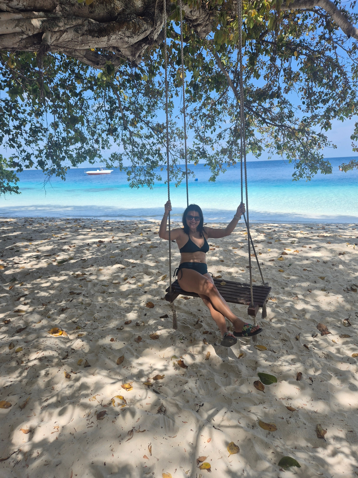 A photograph depicts a woman swinging on a rope swing attached to a tree at a beach in Guraidhoo, Maldives. She wears a black bikini and is holding onto the ropes. The beach is sandy with fallen leaveβ¦read more