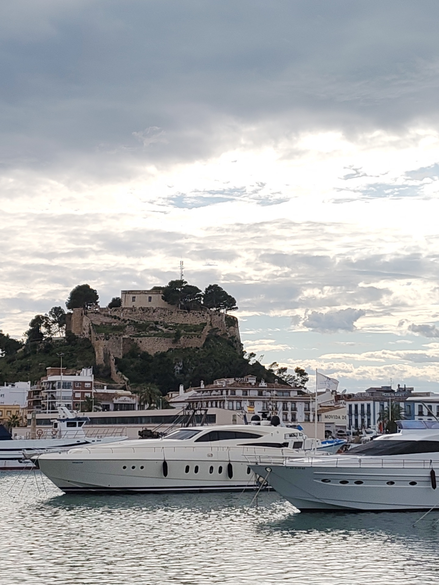 The image captures a waterfront scene in Dénia, Spain, featuring a medieval castle perched atop a hill overlooking the harbor. In the foreground, two luxury yachts are docked in the water. The city's…read more