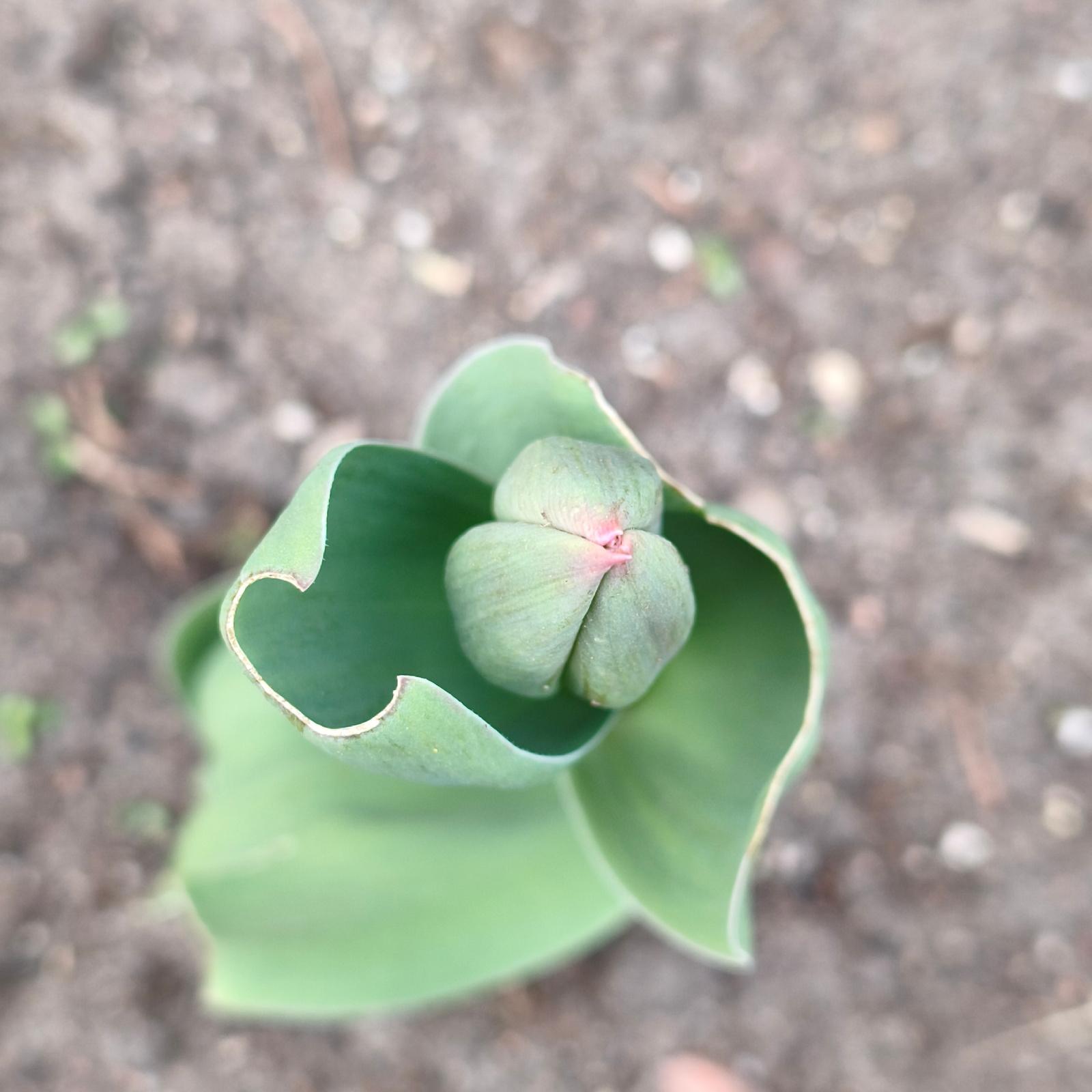 A top-down close-up shot shows a young tulip plant with closed petals emerging from the soil in an outdoor setting. The soil appears to be a mix of brown and gray shades with small pebbles scattered t…read more