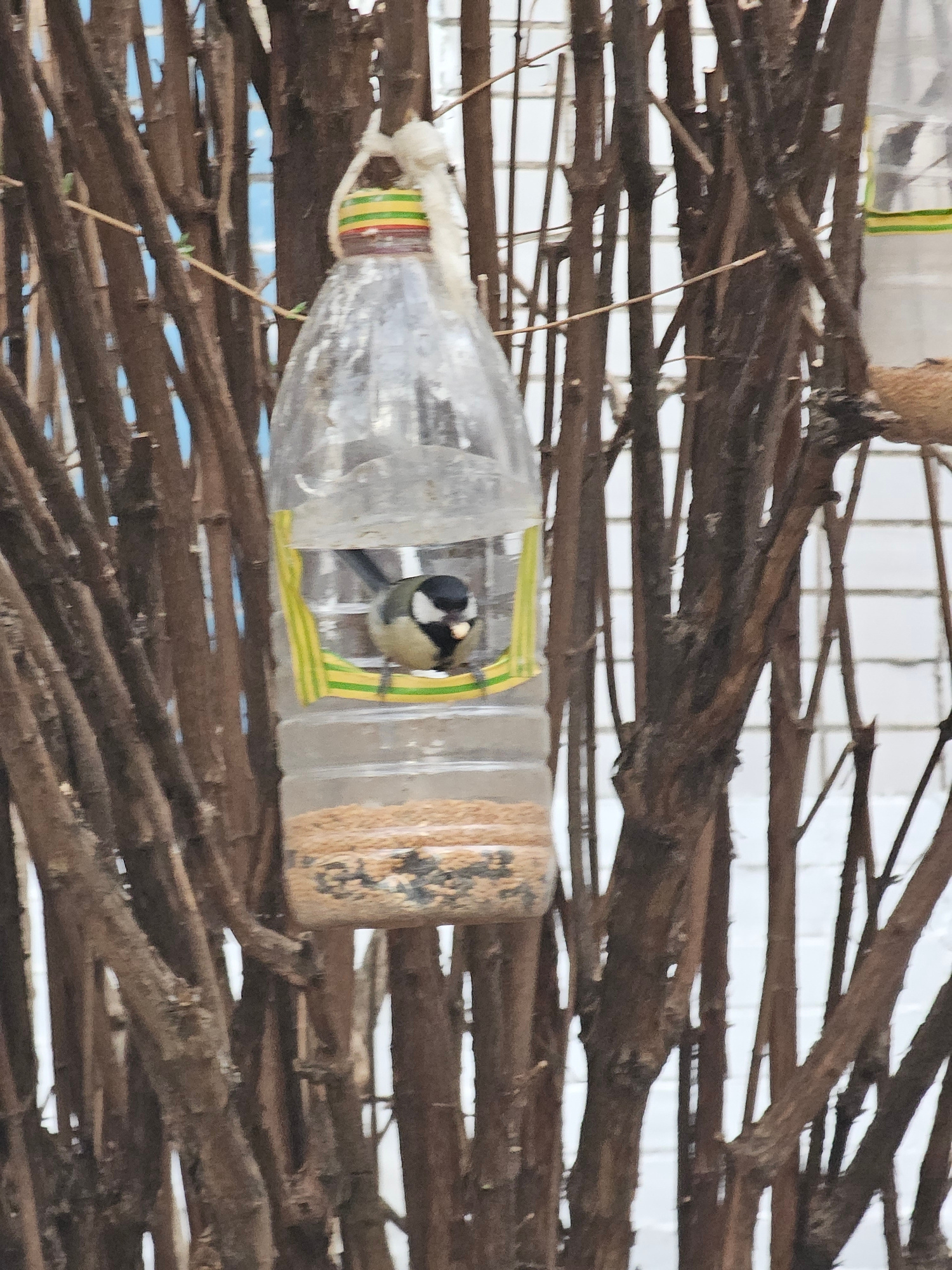 The image shows a bird feeder made from a recycled plastic bottle hanging among intertwined branches, likely part of a fence or trellis. A small bird, possibly a tit, is inside the feeder. The feeder…read more