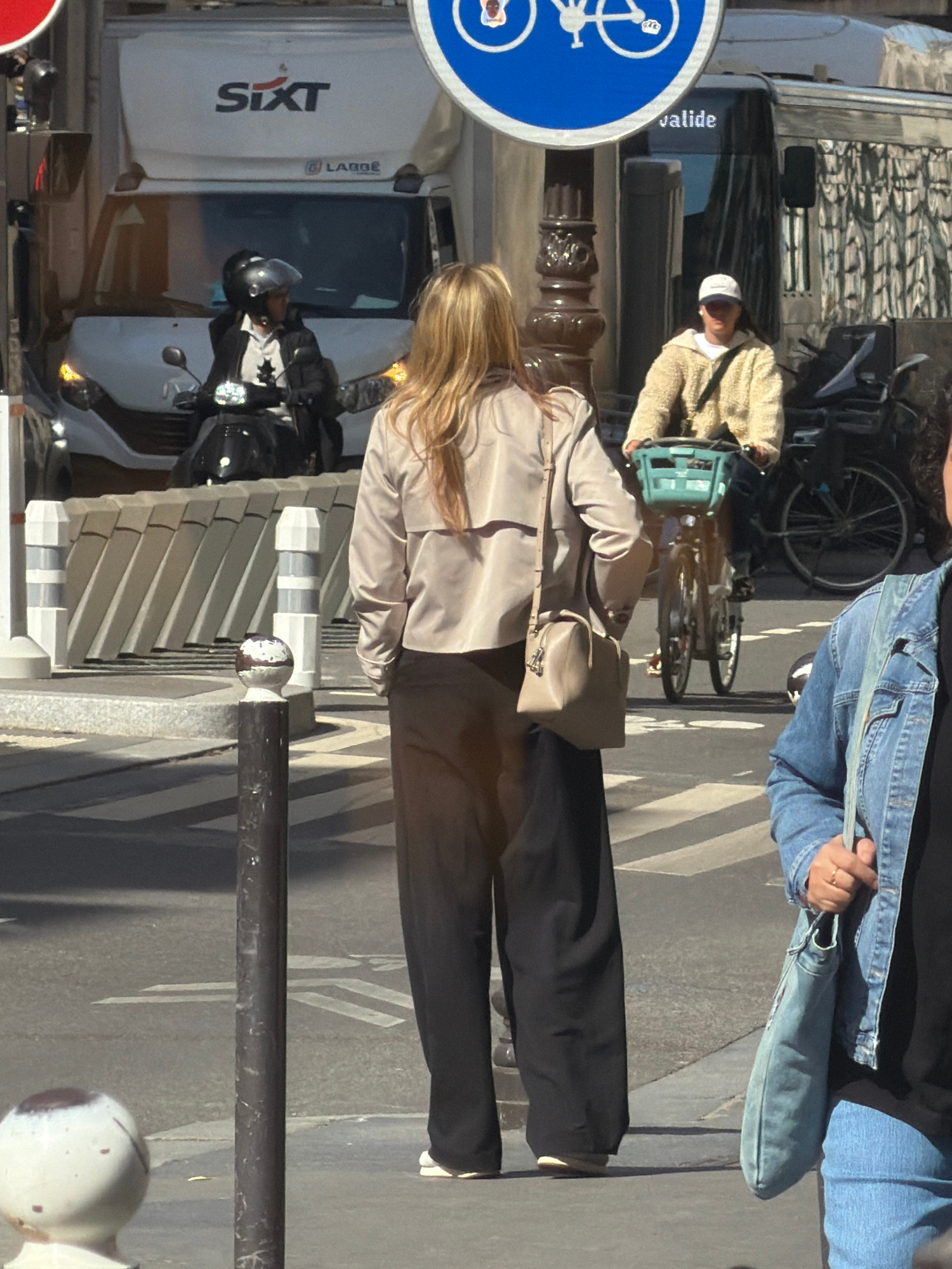 A street scene in Paris, France, shows a person with blonde hair, wearing a beige jacket and black pants, walking on the sidewalk, with a light beige crossbody bag on their shoulder. Next to them is a…read more