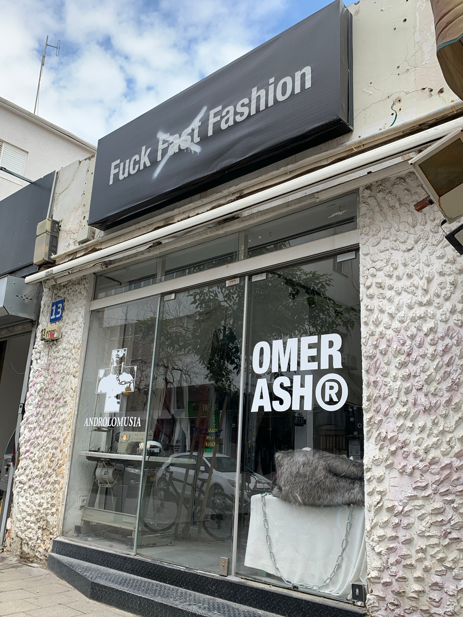 Here is a description of the image: The image shows the storefront of a clothing shop in Tel Aviv, Israel. The awning above the store is black with white text reading "Fuck Fast Fashion" with an "X"…read more