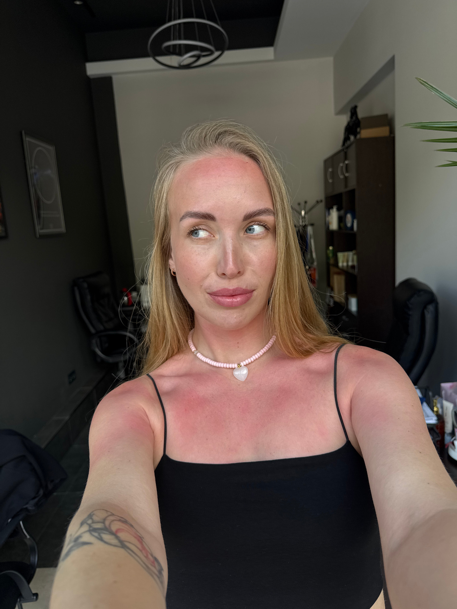 A woman with blonde hair and fair skin is centered in the image, wearing a black tank top and a pink beaded necklace with a white heart pendant. She is taking a selfie, holding the camera at arm's len…read more