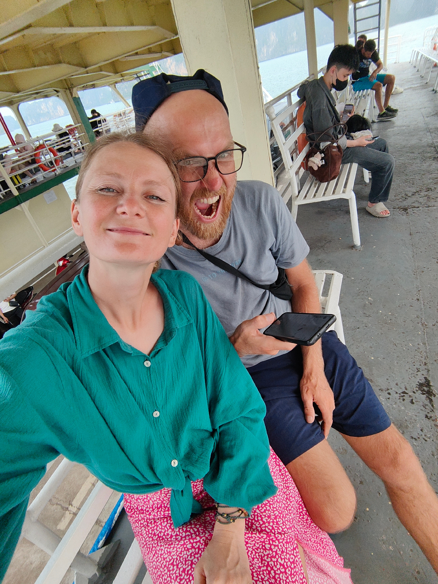 A selfie captures a fair-skinned woman with a serene smile, donning a green button-up shirt tied at the waist over a pink-patterned skirt, seated on a white slatted bench. Beside her, a fair-skinned m…read more