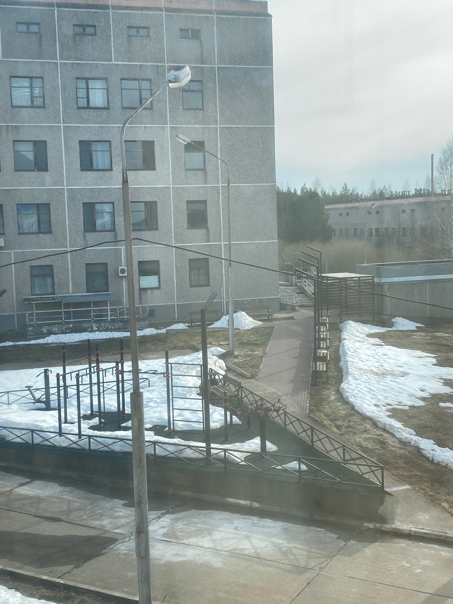 A drab, gray, post-Soviet apartment building dominates the scene, its facade punctuated by rows of windows. A bare street lamp extends from the building. In front of the building, a series of metal st…read more