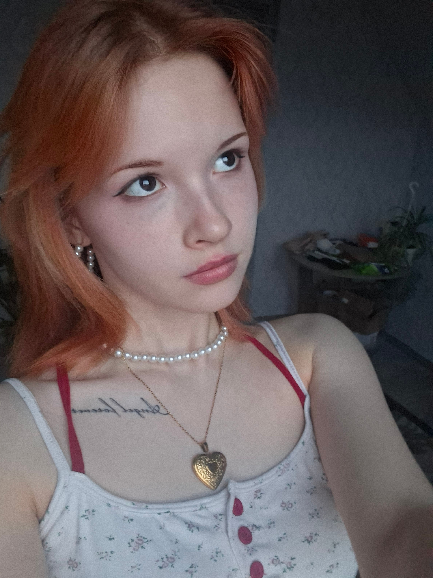 The image is a close-up selfie of a young woman, likely taken indoors in Chaikovsky, Russia. She has fair skin, vibrant reddish-orange hair, and light-colored eyes defined with winged black eyeliner.…read more