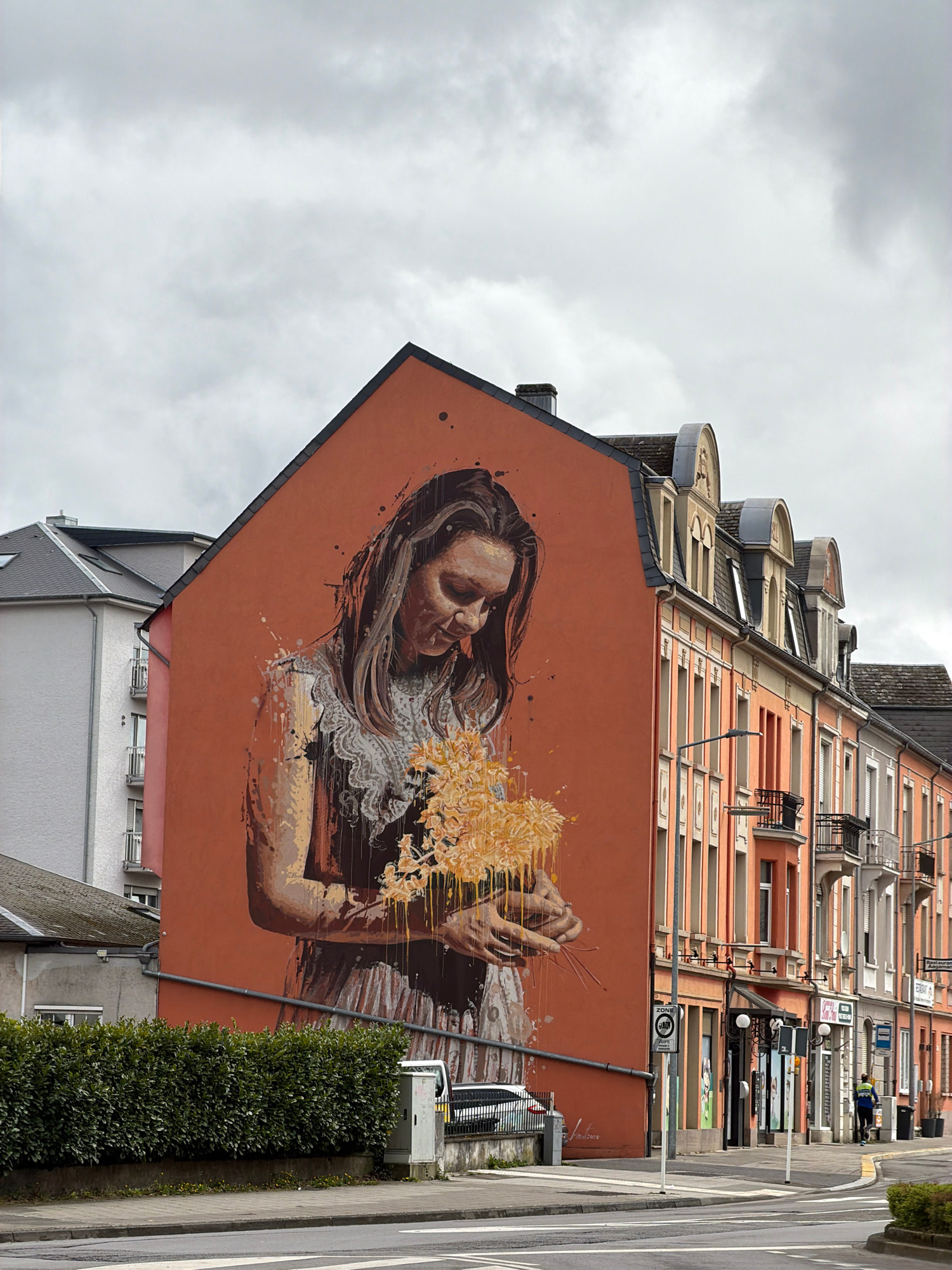A mural of a woman holding yellow flowers is painted on the side of a building in Esch-sur-Alzette, Luxembourg. The woman has long brown hair and is wearing a lace-trimmed top. The building is locatedβ¦read more