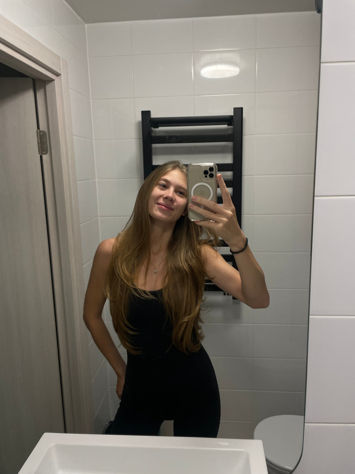 A young woman takes a mirror selfie in a bathroom. She is wearing a black tank top and leggings. She holds a phone up with her right hand. The bathroom has white tile walls, a gray door, a black towel…read more
