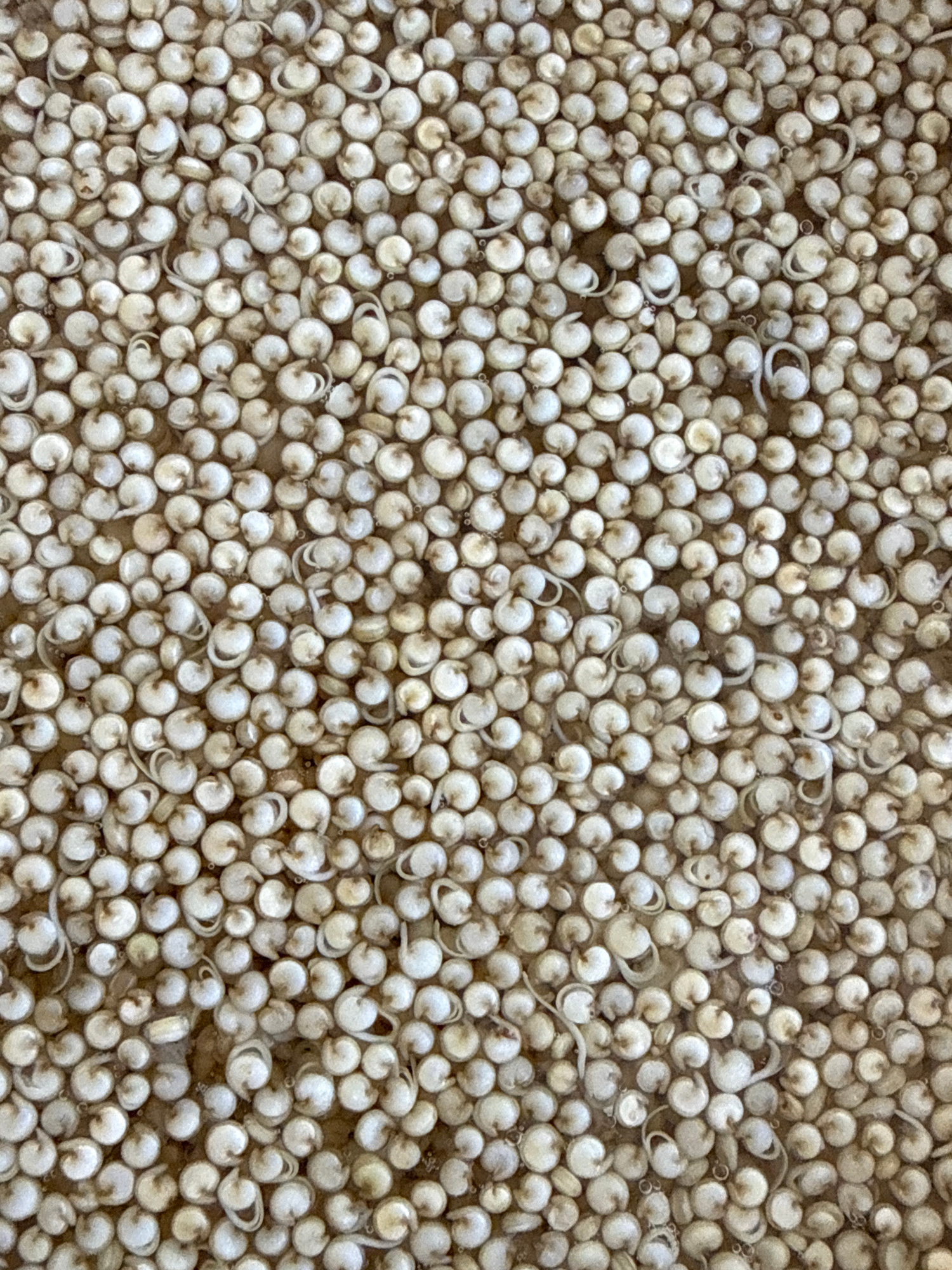 A densely packed collection of small, off-white, spherical objects fills the frame. Each object has a small, curved, tail-like appendage attached. The objects appear to be partially submerged in a sliβ¦read more