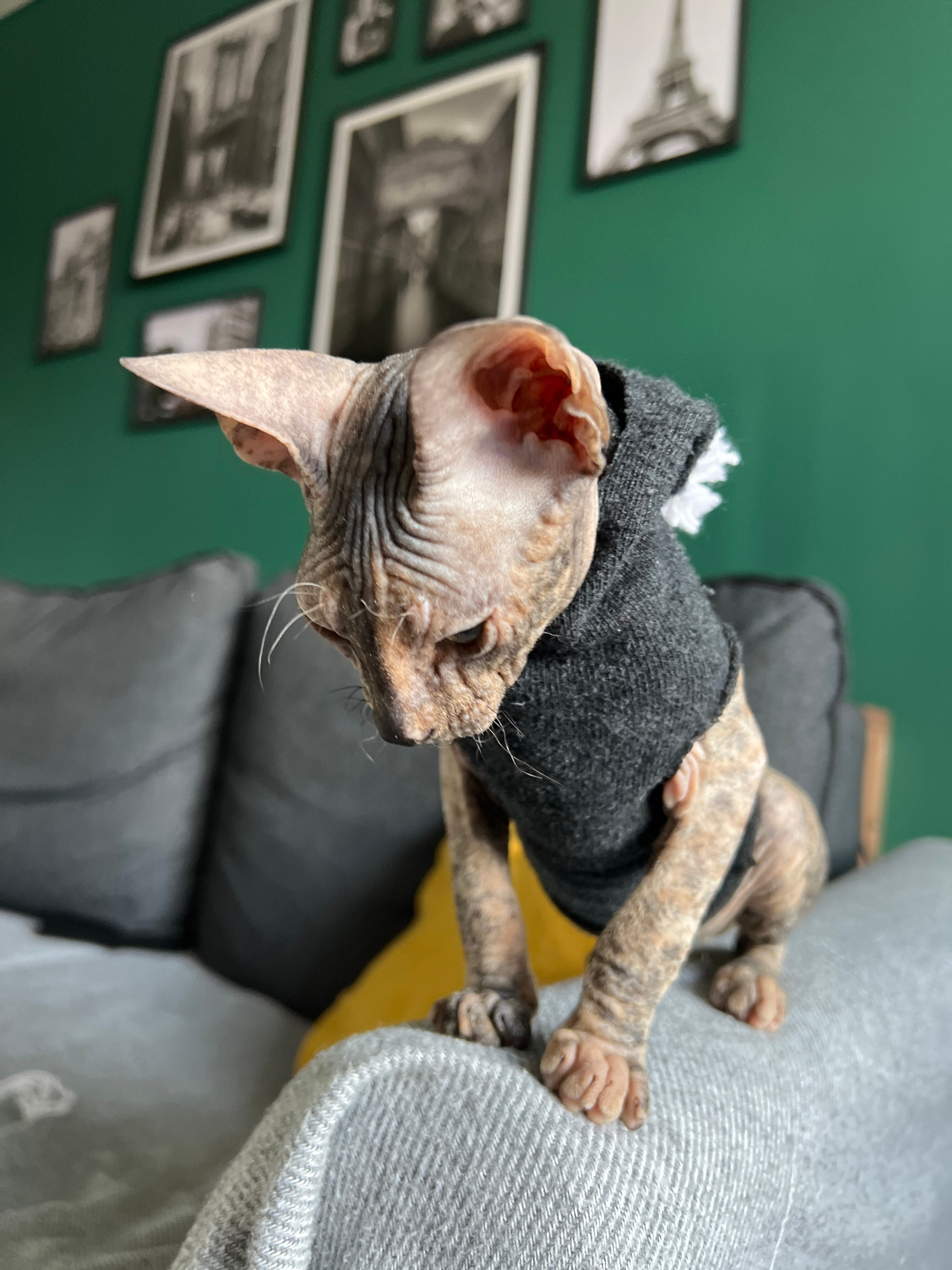 A Sphynx cat wearing a dark grey sweater is resting on a grey couch. The cat's head is tilted, with one ear clearly visible. The cat's paws are also visible on the couch. A green wall with framed blac…read more